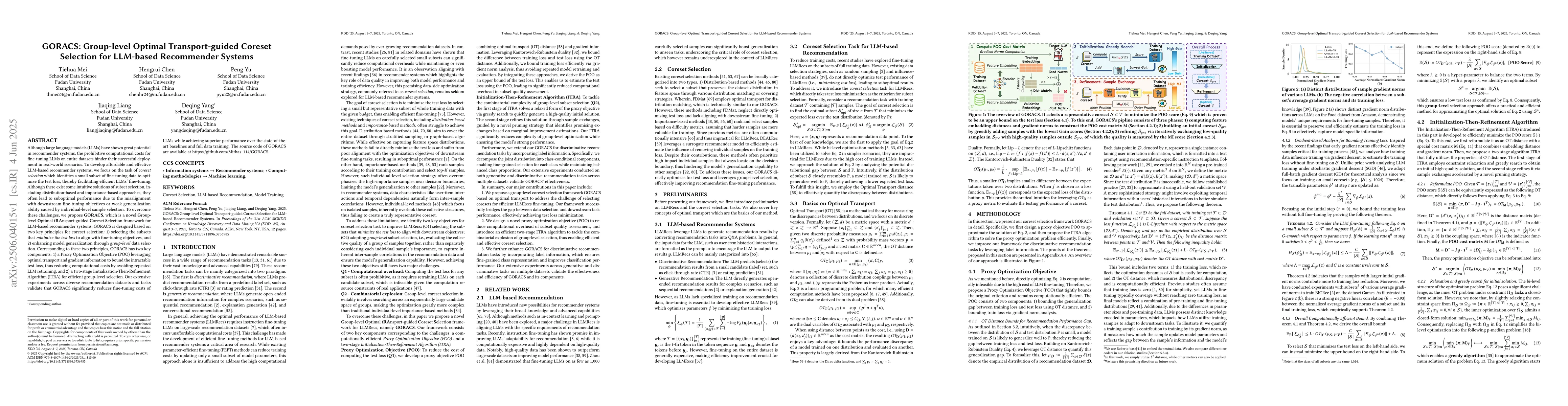 Although large language models (LLMs) have shown great potential in recommender systems, the prohibitive computational costs for fine-tuning LLMs on entire datasets hinder their successful deployment in real-world scenarios. To develop affordable and effective LLM-based recommender systems, we focus on the task of coreset selection which identifies a small subset of fine-tuning data to optimize the test loss, thereby facilitating efficient LLMs' fine-tuning. Although there exist some intuitive solutions of subset selection, including distribution-based and importance-based approaches, they often lead to suboptimal performance due to the misalignment with downstream fine-tuning objectives or weak generalization ability caused by individual-level sample selection. To overcome these challenges, we propose GORACS, which is a novel Group-level Optimal tRAnsport-guided Coreset Selection framework for LLM-based recommender systems. GORACS is designed based on two key principles for coreset selection: 1) selecting the subsets that minimize the test loss to align with fine-tuning objectives, and 2) enhancing model generalization through group-level data selection. Corresponding to these two principles, GORACS has two key components: 1) a Proxy Optimization Objective (POO) leveraging optimal transport and gradient information to bound the intractable test loss, thus reducing computational costs by avoiding repeated LLM retraining, and 2) a two-stage Initialization-Then-Refinement Algorithm (ITRA) for efficient group-level selection. Our extensive experiments across diverse recommendation datasets and tasks validate that GORACS significantly reduces fine-tuning costs of LLMs while achieving superior performance over the state-of-the-art baselines and full data training. The source code of GORACS are available at https://github.com/Mithas-114/GORACS.