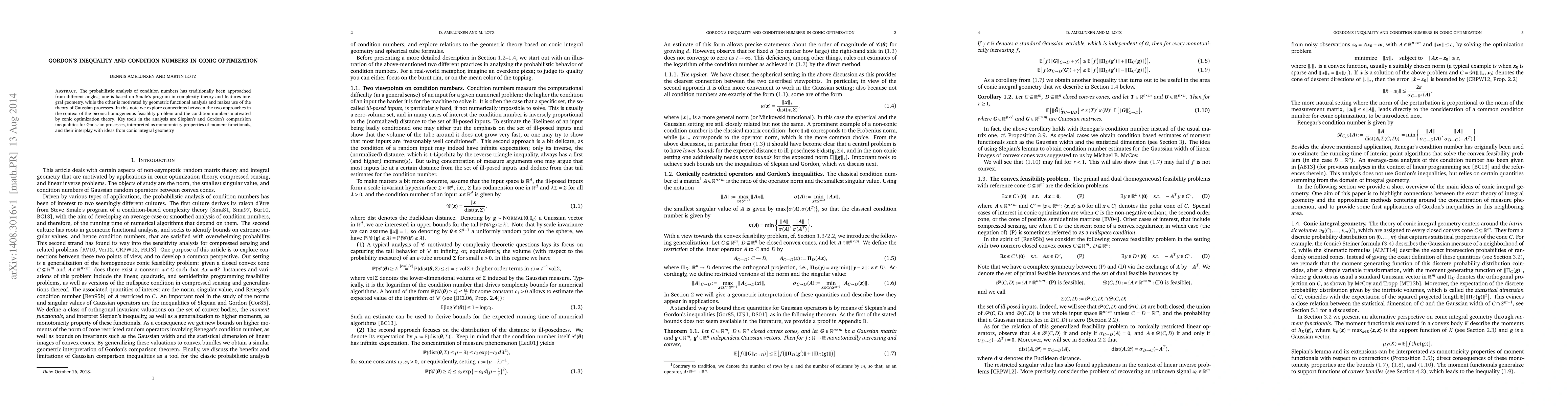 Title: Gordon's inequality and condition numbers in conic optimization Summary: This paper examines the links between probabilistic approaches to condition numbers in conic optimization, using Slepian's and Gordon's inequalities for Gaussian processes, and conic integral geometry to analyze the biconic homogeneous feasibility problem.