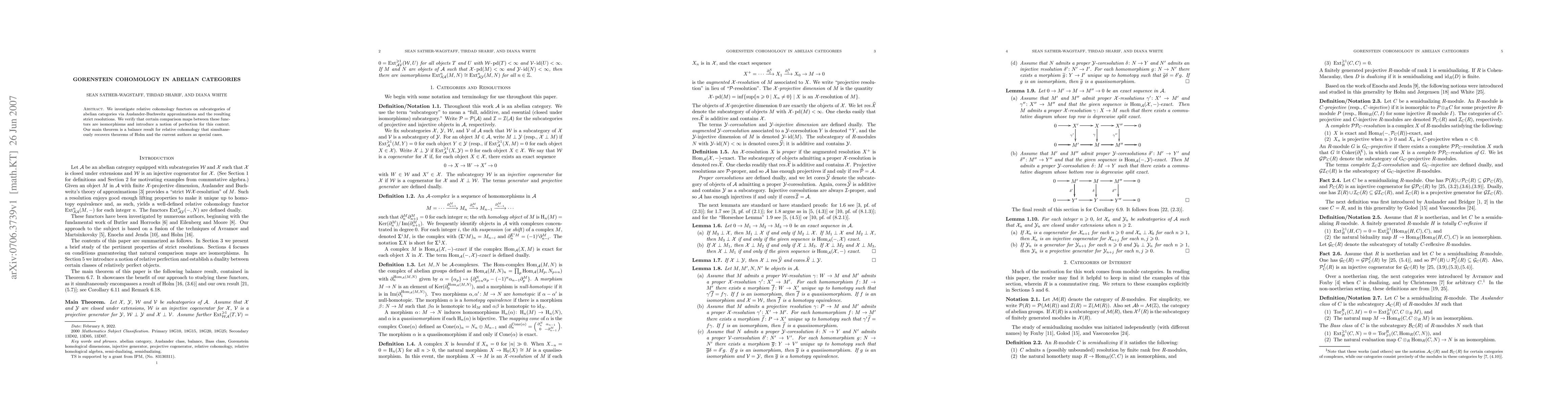 This paper explores relative cohomology functors in abelian categories using Auslander-Buchweitz approximations, proving that specific comparison maps are isomorphisms and introducing a concept of perfection. The main theorem establishes a balance result for relative cohomology, encompassing prior results by Holm and the authors.