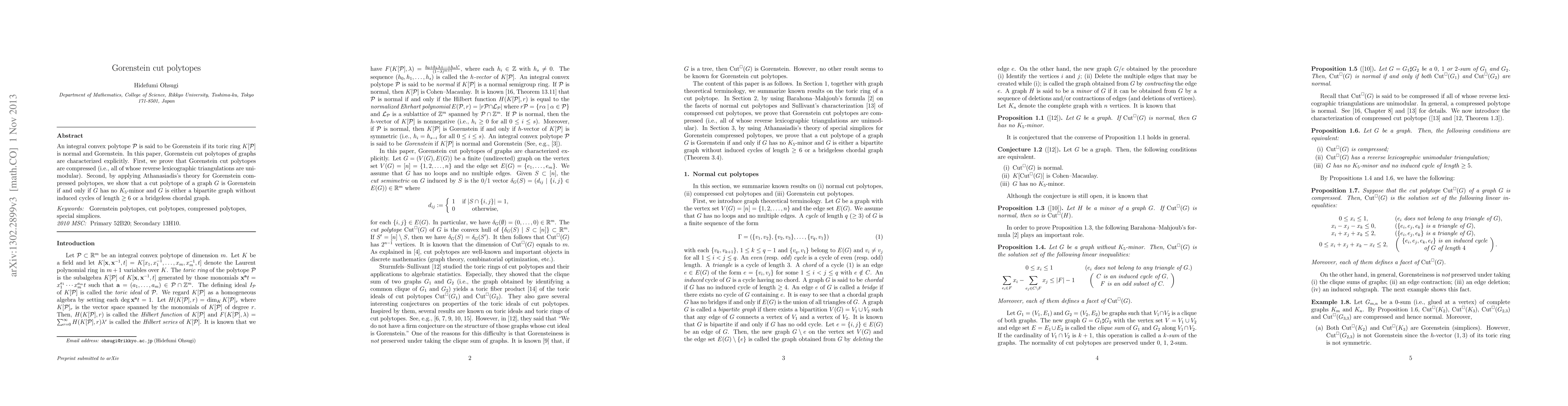 Two-line summary: This paper characterizes Gorenstein cut polytopes of graphs, proving they are compressed and showing they are Gorenstein if and only if the graph has no $K_5$-minor and either is bipartite without long induced cycles or is a bridgeless chordal graph. The findings rely on Athanasiadis's theory for Gorenstein compressed polytopes.