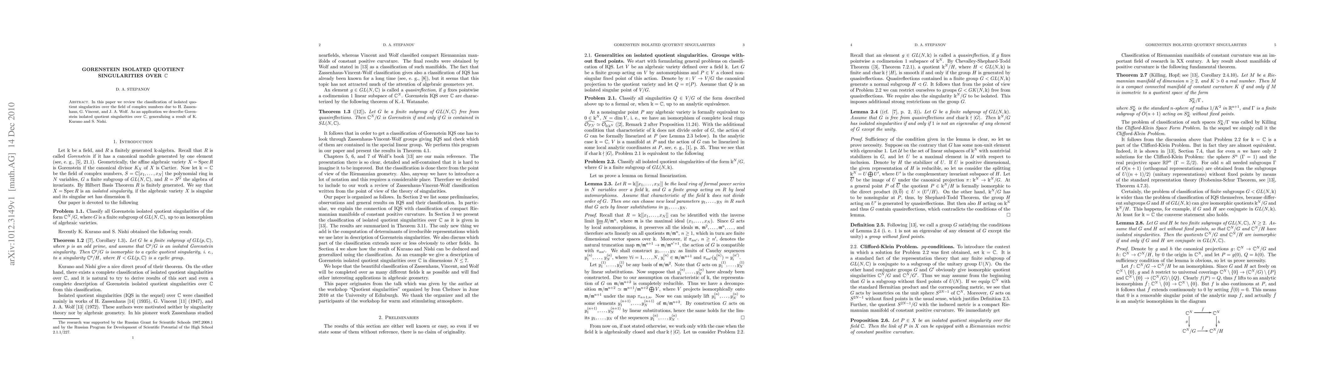 In this paper we review the classification of isolated quotient singularities over the field of complex numbers due to H. Zassenhaus, G. Vincent, and G. A. Wolf. As an application we describe Gorenstein isolated quotient singularities over C, generalizing a result of K. Kurano and S. Nishi.