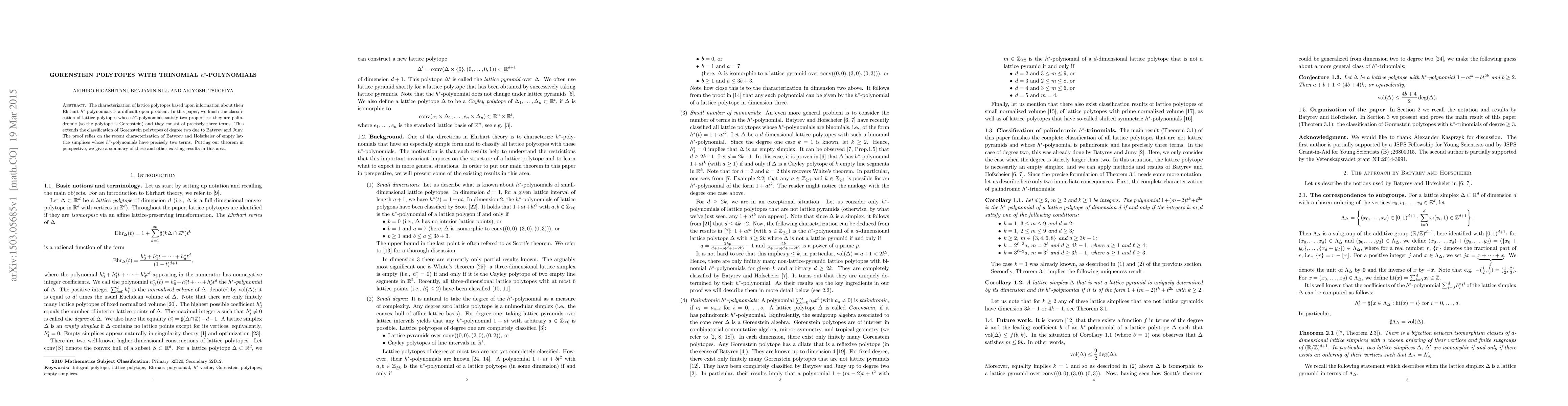 The characterization of lattice polytopes based upon information about their Ehrhart $h^*$-polynomials is a difficult open problem. In this paper, we finish the classification of lattice polytopes whose $h^*$-polynomials satisfy two properties: they are palindromic (so the polytope is Gorenstein) and they consist of precisely three terms. This extends the classification of Gorenstein polytopes of degree two due to Batyrev and Juny. The proof relies on the recent characterization of Batyrev and Hofscheier of empty lattice simplices whose $h^*$-polynomials have precisely two terms. Putting our theorem in perspective, we give a summary of these and other existing results in this area.