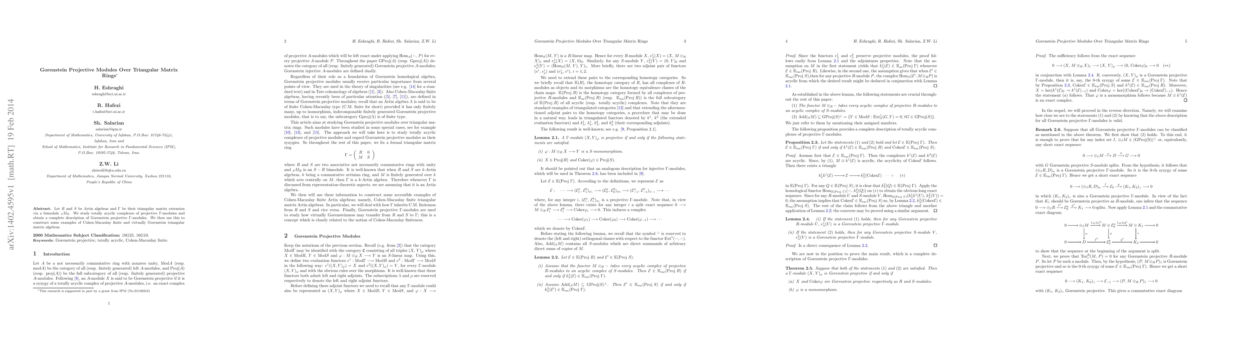 Summary: The paper classifies Gorenstein projective modules over triangular matrix rings by examining totally acyclic complexes of projective modules and applies this classification to provide insights into Cohen-Macaulay finite and virtually Gorenstein triangular matrix artin algebras.