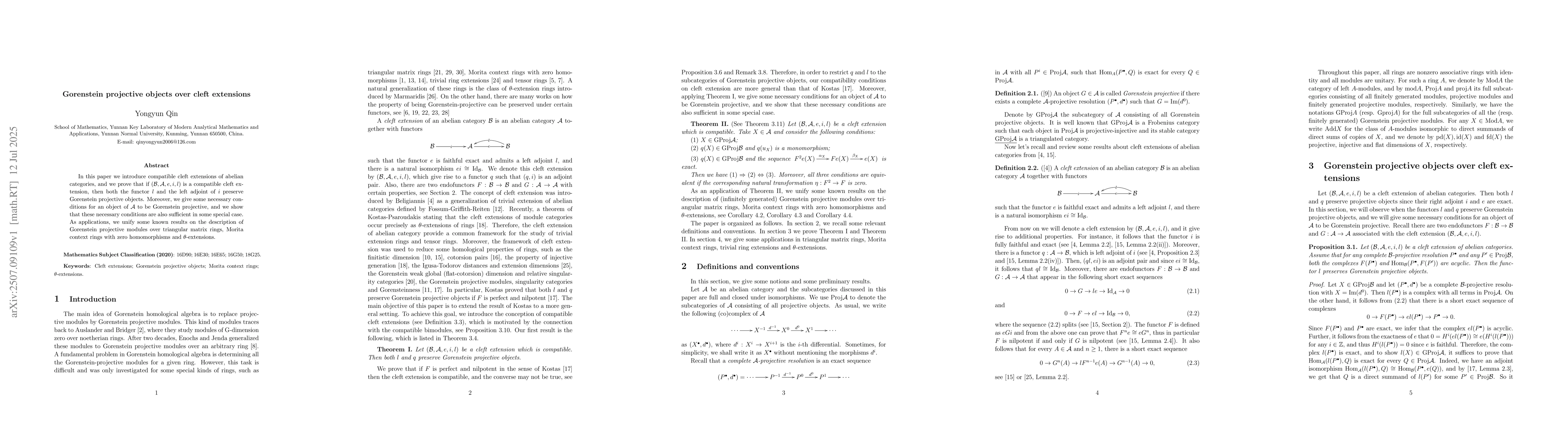 In this paper we introduce compatible cleft extensions of abelian categories, and we prove that if $(\mathcal{B},\mathcal{A}, e,i,l)$ is a compatible cleft extension, then both the functor $l$ and the left adjoint of $i$ preserve Gorenstein projective objects. Moreover, we give some necessary conditions for an object of $\mathcal{A}$ to be Gorenstein projective, and we show that these necessary conditions are also sufficient in some special case. As applications, we unify some known results on the description of Gorenstein projective modules over triangular matrix rings, Morita context rings with zero homomorphisms and $\theta$-extensions.