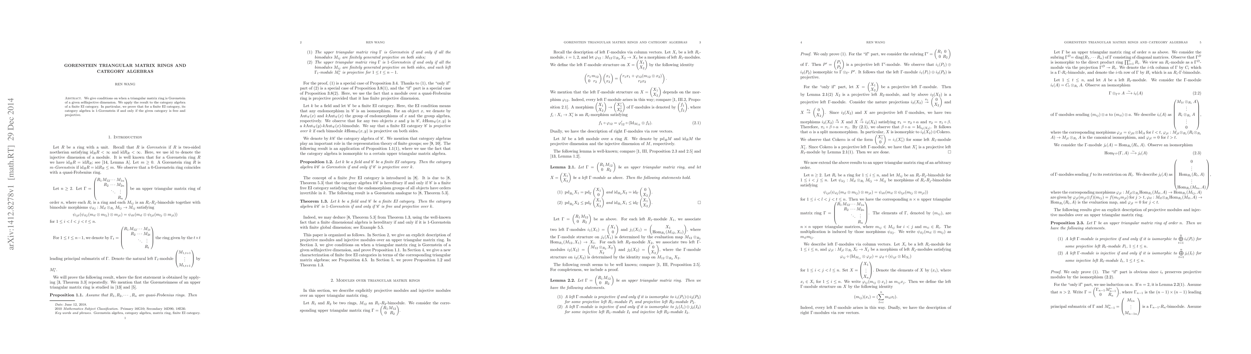 This paper establishes conditions for triangular matrix rings to be Gorenstein with a specified selfinjective dimension, and applies this to category algebras of finite EI categories, proving that their category algebra is 1-Gorenstein if and only if the category is both free and projective.