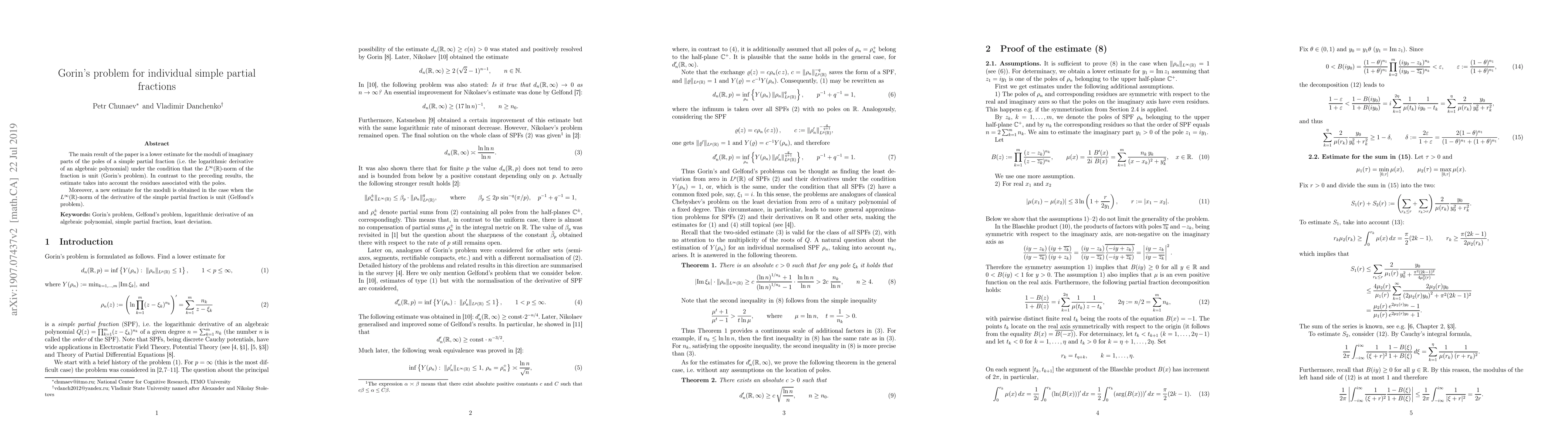 The main result of the paper is a lower estimate for the moduli of imaginary parts of the poles of a simple partial fraction (i.e. the logarithmic derivative of an algebraic polynomial) under the condition that the $L^\infty(\mathbb{R})$-norm of the fraction is unit (Gorin's problem). In contrast to the preceding results, the estimate takes into account the residues associated with the poles. Moreover, a new estimate for the moduli is obtained in the case when the $L^\infty(\mathbb{R})$-norm of the derivative of the simple partial fraction is unit (Gelfond's problem).