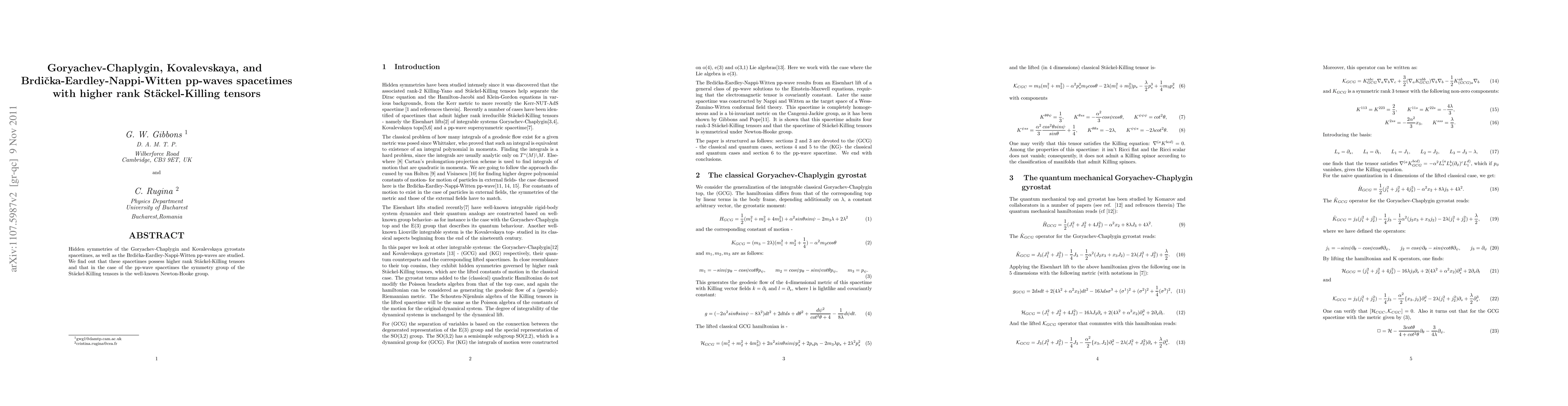 This paper investigates hidden symmetries in the Goryachev-Chaplygin and Kovalevskaya gyrostats, as well as Brdička-Eardley-Nappi-Witten pp-waves, revealing the presence of higher rank Stäckel-Killing tensors, with the pp-wave spacetimes exhibiting symmetry via the Newton-Hooke group.