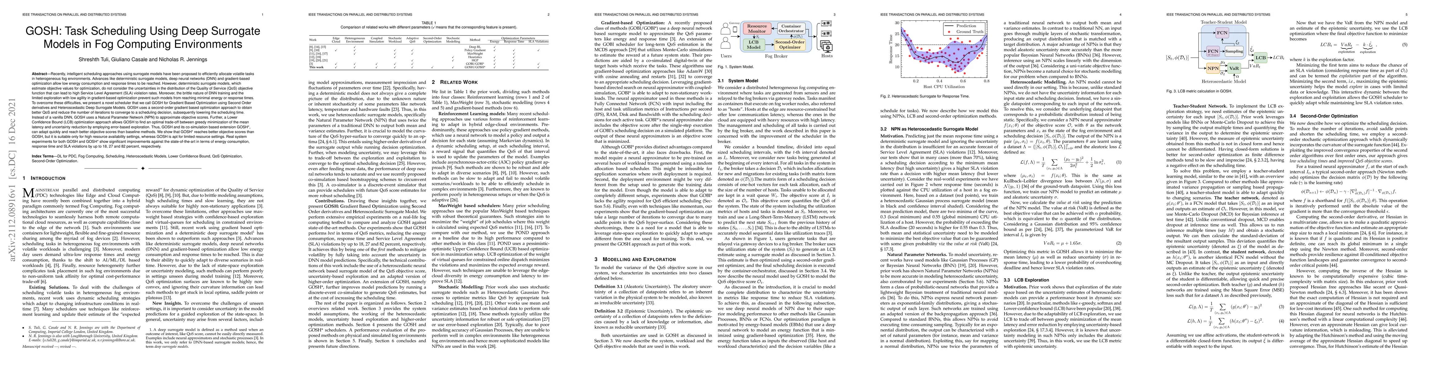 Recently, intelligent scheduling approaches using surrogate models have been proposed to efficiently allocate volatile tasks in heterogeneous fog environments. Advances like deterministic surrogate models, deep neural networks (DNN) and gradient-based optimization allow low energy consumption and response times to be reached. However, deterministic surrogate models, which estimate objective values for optimization, do not consider the uncertainties in the distribution of the Quality of Service (QoS) objective function that can lead to high Service Level Agreement (SLA) violation rates. Moreover, the brittle nature of DNN training and prevent such models from reaching minimal energy or response times. To overcome these difficulties, we present a novel scheduler: GOSH i.e. Gradient Based Optimization using Second Order derivatives and Heteroscedastic Deep Surrogate Models. GOSH uses a second-order gradient based optimization approach to obtain better QoS and reduce the number of iterations to converge to a scheduling decision, subsequently lowering the scheduling time. Instead of a vanilla DNN, GOSH uses a Natural Parameter Network to approximate objective scores. Further, a Lower Confidence Bound optimization approach allows GOSH to find an optimal trade-off between greedy minimization of the mean latency and uncertainty reduction by employing error-based exploration. Thus, GOSH and its co-simulation based extension GOSH*, can adapt quickly and reach better objective scores than baseline methods. We show that GOSH* reaches better objective scores than GOSH, but it is suitable only for high resource availability settings, whereas GOSH is apt for limited resource settings. Real system experiments for both GOSH and GOSH* show significant improvements against the state-of-the-art in terms of energy consumption, response time and SLA violations by up to 18, 27 and 82 percent, respectively.