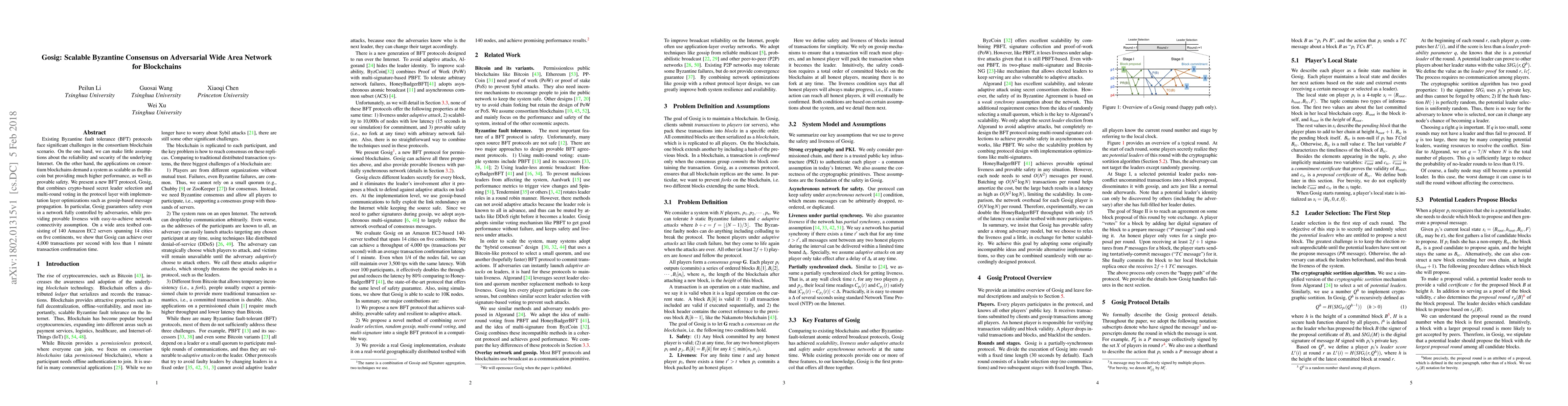 Existing Byzantine fault tolerance (BFT) protocols face significant challenges in the consortium blockchain scenario. On the one hand, we can make little assumptions about the reliability and security of the underlying Internet. On the other hand, the applications on consortium blockchains demand a system as scalable as the Bit-coin but providing much higher performance, as well as provable safety. We present a new BFT protocol, Gosig, that combines crypto-based secret leader selection and multi-round voting in the protocol layer with implementation layer optimizations such as gossip-based message propagation. In particular, Gosig guarantees safety even in a network fully controlled by adversaries, while providing provable liveness with easy-to-achieve network connectivity assumption. On a wide area testbed consisting of 140 Amazon EC2 servers spanning 14 cities on five continents, we show that Gosig can achieve over 4,000 transactions per second with less than 1 minute transaction confirmation time.