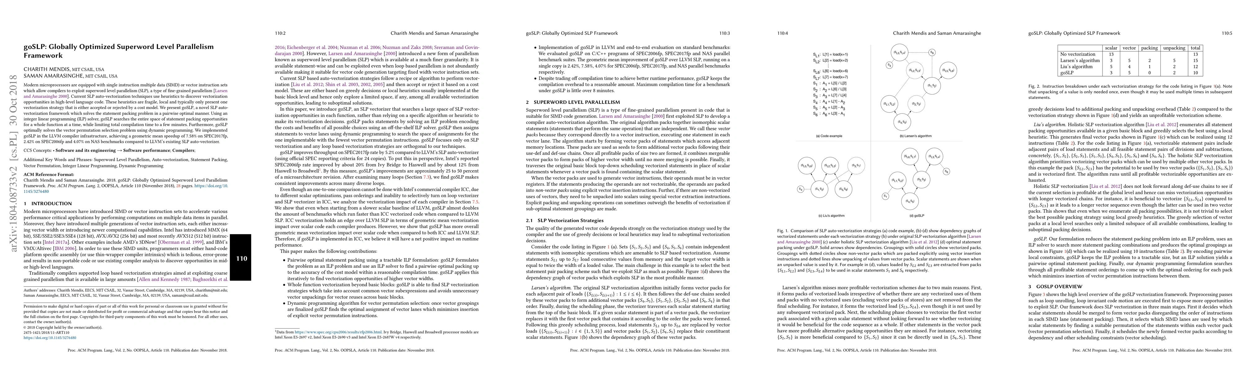 The goSLP framework optimizes superword level parallelism (SLP) using integer linear programming and dynamic programming to globally search for vectorization opportunities, achieving significant speedups over existing LLVM auto-vectorizers on various benchmarks.