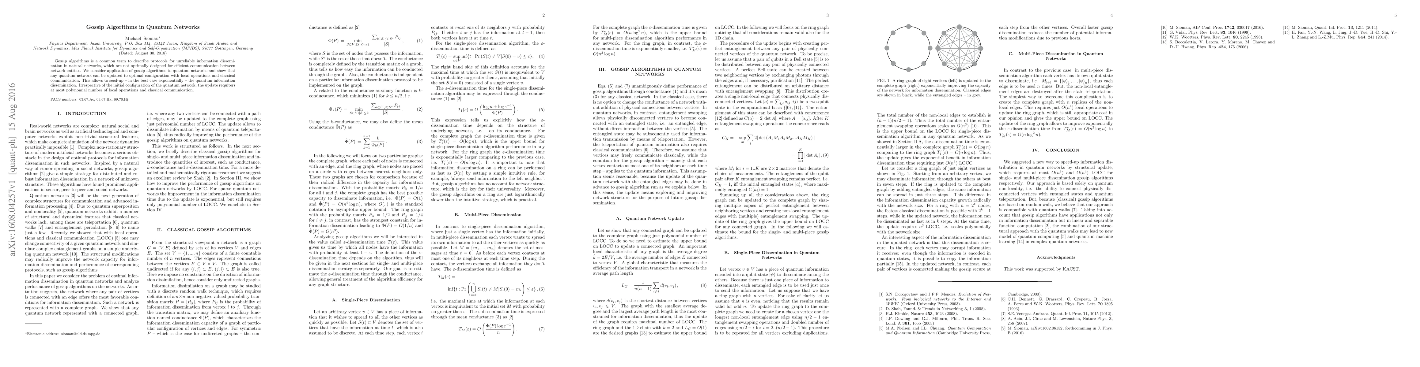 Summary: This paper explores the application of gossip algorithms to quantum networks, demonstrating that they can be optimally updated through local operations and classical communication, significantly enhancing quantum information dissemination irrespective of the initial network configuration. The update process requires at most a polynomial number of local operations and classical communication.