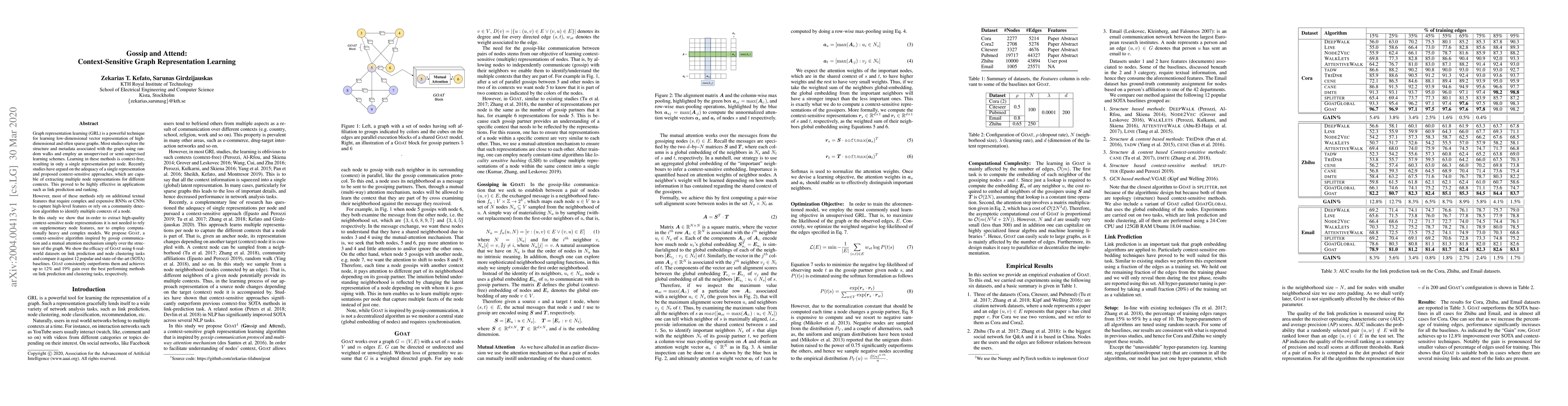 Graph representation learning (GRL) is a powerful technique for learning low-dimensional vector representation of high-dimensional and often sparse graphs. Most studies explore the structure and metadata associated with the graph using random walks and employ an unsupervised or semi-supervised learning schemes. Learning in these methods is context-free, resulting in only a single representation per node. Recently studies have argued on the adequacy of a single representation and proposed context-sensitive approaches, which are capable of extracting multiple node representations for different contexts. This proved to be highly effective in applications such as link prediction and ranking. However, most of these methods rely on additional textual features that require complex and expensive RNNs or CNNs to capture high-level features or rely on a community detection algorithm to identify multiple contexts of a node. In this study we show that in-order to extract high-quality context-sensitive node representations it is not needed to rely on supplementary node features, nor to employ computationally heavy and complex models. We propose GOAT, a context-sensitive algorithm inspired by gossip communication and a mutual attention mechanism simply over the structure of the graph. We show the efficacy of GOAT using 6 real-world datasets on link prediction and node clustering tasks and compare it against 12 popular and state-of-the-art (SOTA) baselines. GOAT consistently outperforms them and achieves up to 12% and 19% gain over the best performing methods on link prediction and clustering tasks, respectively.