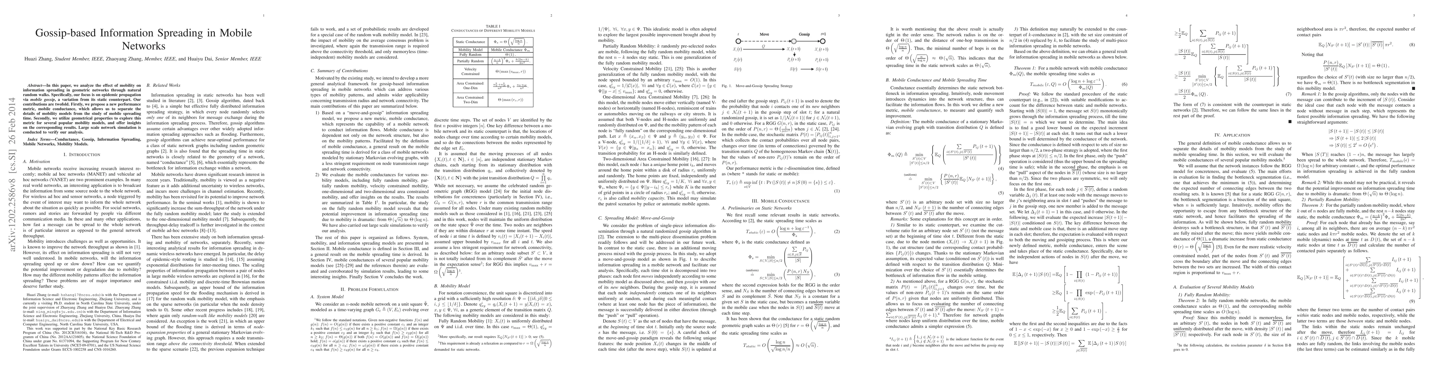 This paper analyzes how mobility affects information spreading in mobile networks using gossip algorithms, introducing a new metric called mobile conductance to separate mobility details from spreading time. It explores the mobile conductances of various mobility models and validates findings through large-scale network simulations.