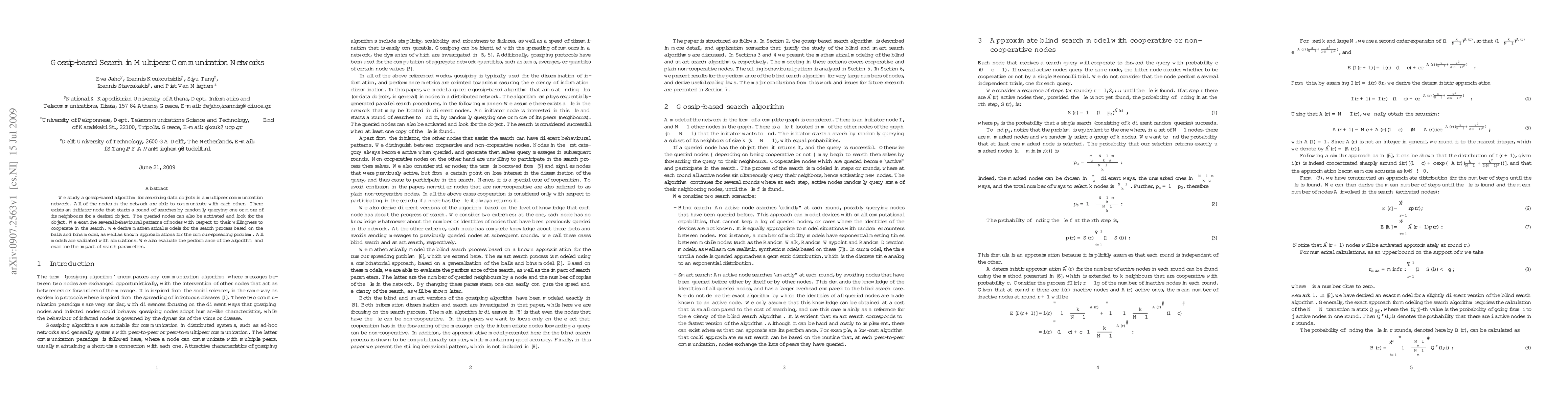 We study a gossip-based algorithm for searching data objects in a multipeer communication network. All of the nodes in the network are able to communicate with each other. There exists an initiator node that starts a round of searches by randomly querying one or more of its neighbors for a desired object. The queried nodes can also be activated and look for the object. We examine several behavioural patterns of nodes with respect to their willingness to cooperate in the search. We derive mathematical models for the search process based on the balls and bins model, as well as known approximations for the rumour-spreading problem. All models are validated with simulations. We also evaluate the performance of the algorithm and examine the impact of search parameters.