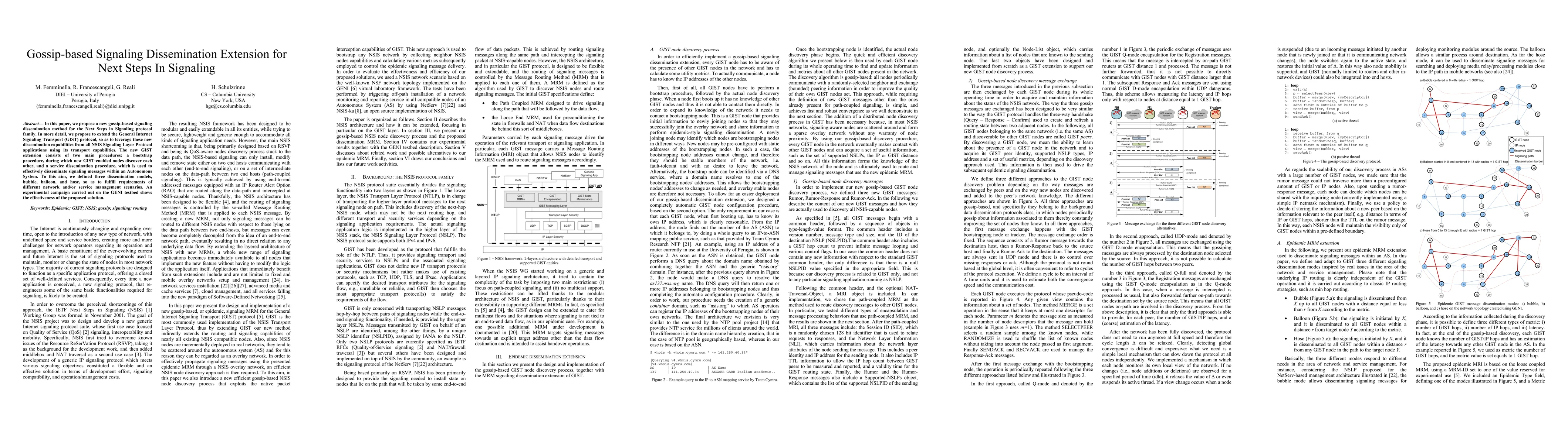 In this paper, we propose a new gossip-based signaling dissemination method for the Next Steps in Signaling protocol family. In more detail, we propose to extend the General Internet Signaling Transport (GIST) protocol, so as to leverage these new dissemination capabilities from all NSIS Signaling Layer Protocol applications using its transport capabilities. The new GIST extension consists of two main procedures: a bootstrap procedure, during which new GIST-enabled nodes discover each other, and a service dissemination procedure, which is used to effectively disseminate signaling messages within an Autonomous System. To this aim, we defined three dissemination models, bubble, balloon, and hose, so as to fulfill requirements of different network and/or service management scenarios. An experimental campaign carried out on the GENI testbed shows the effectiveness of the proposed solution.