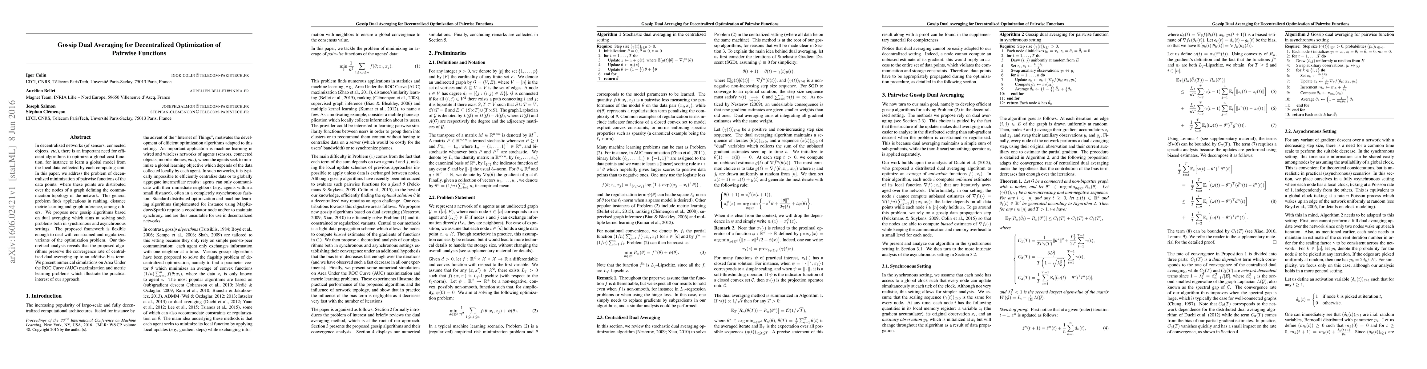 This paper proposes gossip dual averaging algorithms for decentralized optimization of pairwise functions distributed over network nodes. The algorithms maintain convergence rates similar to centralized dual averaging, with practical applications in ranking, distance metric learning, and graph inference.