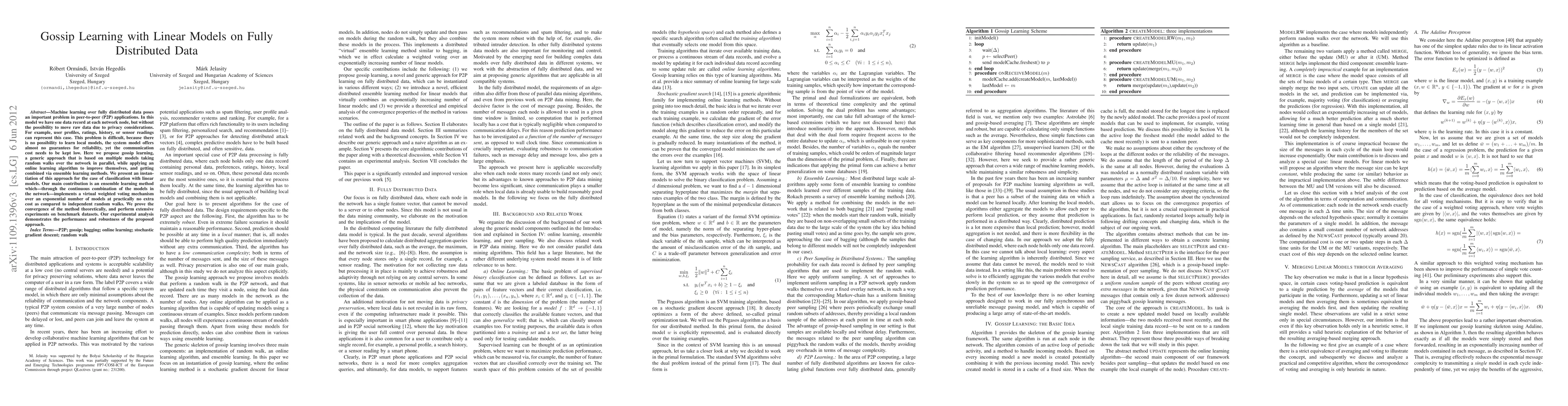 Machine learning over fully distributed data poses an important problem in peer-to-peer (P2P) applications. In this model we have one data record at each network node, but without the possibility to move raw data due to privacy considerations. For example, user profiles, ratings, history, or sensor readings can represent this case. This problem is difficult, because there is no possibility to learn local models, the system model offers almost no guarantees for reliability, yet the communication cost needs to be kept low. Here we propose gossip learning, a generic approach that is based on multiple models taking random walks over the network in parallel, while applying an online learning algorithm to improve themselves, and getting combined via ensemble learning methods. We present an instantiation of this approach for the case of classification with linear models. Our main contribution is an ensemble learning method which---through the continuous combination of the models in the network---implements a virtual weighted voting mechanism over an exponential number of models at practically no extra cost as compared to independent random walks. We prove the convergence of the method theoretically, and perform extensive experiments on benchmark datasets. Our experimental analysis demonstrates the performance and robustness of the proposed approach.