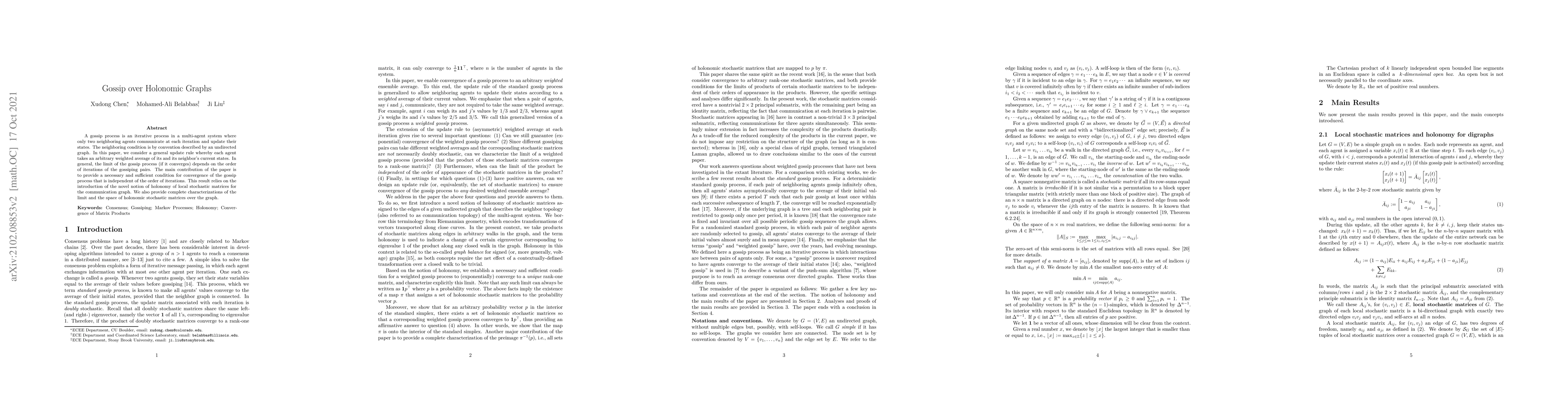 This paper studies a gossip process on a communication graph where agents update their states based on weighted averages of their and their neighbors' states. It introduces the concept of holonomy for local stochastic matrices to provide a convergence condition for the gossip process that is independent of the iteration order, and characterizes the limit and the space of holonomic stochastic matrices.