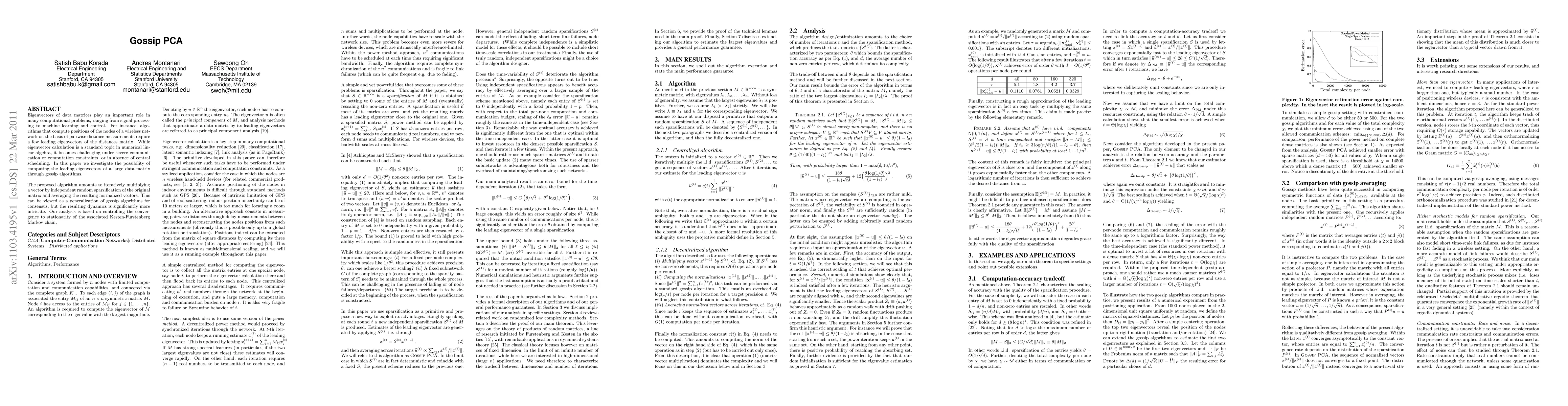 Eigenvectors of data matrices play an important role in many computational problems, ranging from signal processing to machine learning and control. For instance, algorithms that compute positions of the nodes of a wireless network on the basis of pairwise distance measurements require a few leading eigenvectors of the distances matrix. While eigenvector calculation is a standard topic in numerical linear algebra, it becomes challenging under severe communication or computation constraints, or in absence of central scheduling. In this paper we investigate the possibility of computing the leading eigenvectors of a large data matrix through gossip algorithms. The proposed algorithm amounts to iteratively multiplying a vector by independent random sparsification of the original matrix and averaging the resulting normalized vectors. This can be viewed as a generalization of gossip algorithms for consensus, but the resulting dynamics is significantly more intricate. Our analysis is based on controlling the convergence to stationarity of the associated Kesten-Furstenberg Markov chain.