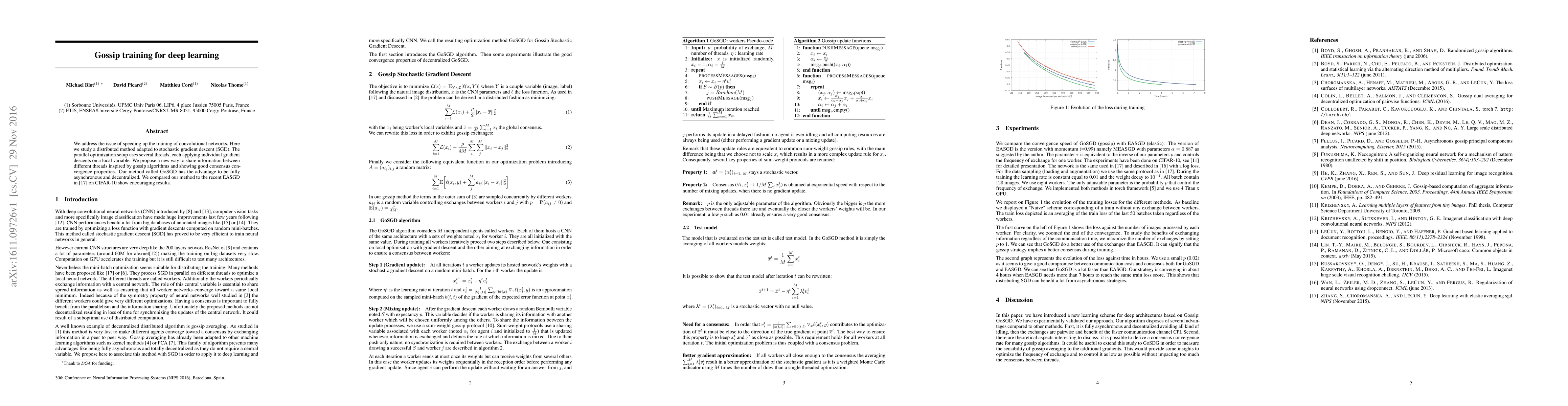 This paper proposes GoSGD, a decentralized, asynchronous gossip-based method for speeding up distributed training of convolutional networks. Compared to EASGD on CIFAR-10, GoSGD demonstrates promising convergence and efficiency improvements.