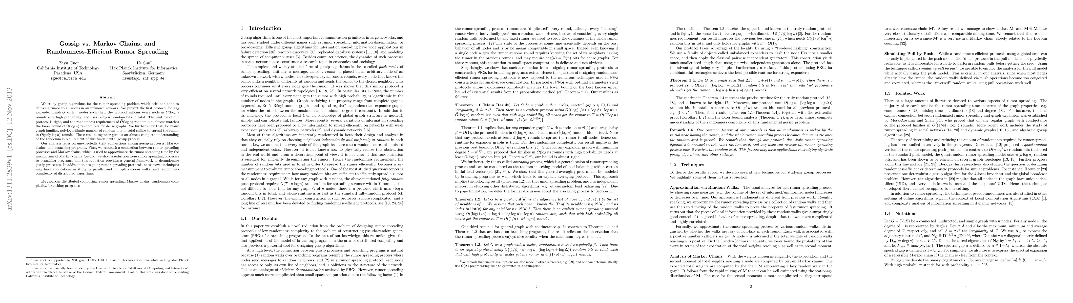 This paper presents a novel gossip protocol for rumor spreading in expander graphs, achieving optimal $O(\log n)$ rounds and $\tilde{O}(\log n)$ random bits. The analysis reveals tight connections between gossip processes, Markov chains, and branching programs, offering a framework for derandomization and potential applications in distributed algorithms.