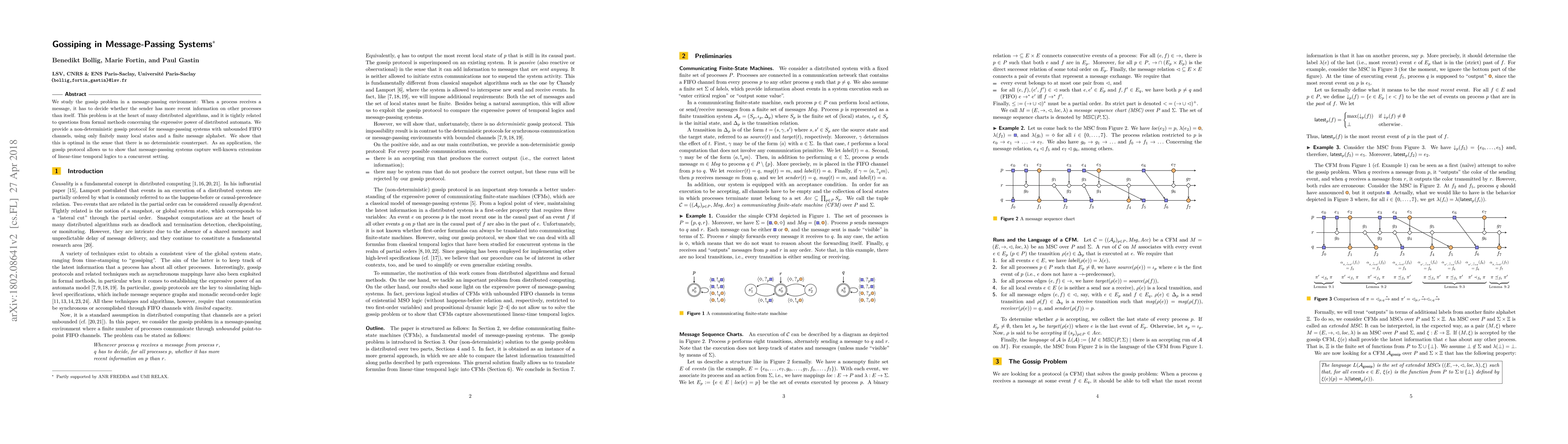 This paper presents a non-deterministic gossip protocol for message-passing systems, demonstrating its optimality over deterministic alternatives. It also shows that these systems can effectively capture extensions of linear-time temporal logics in concurrent settings.