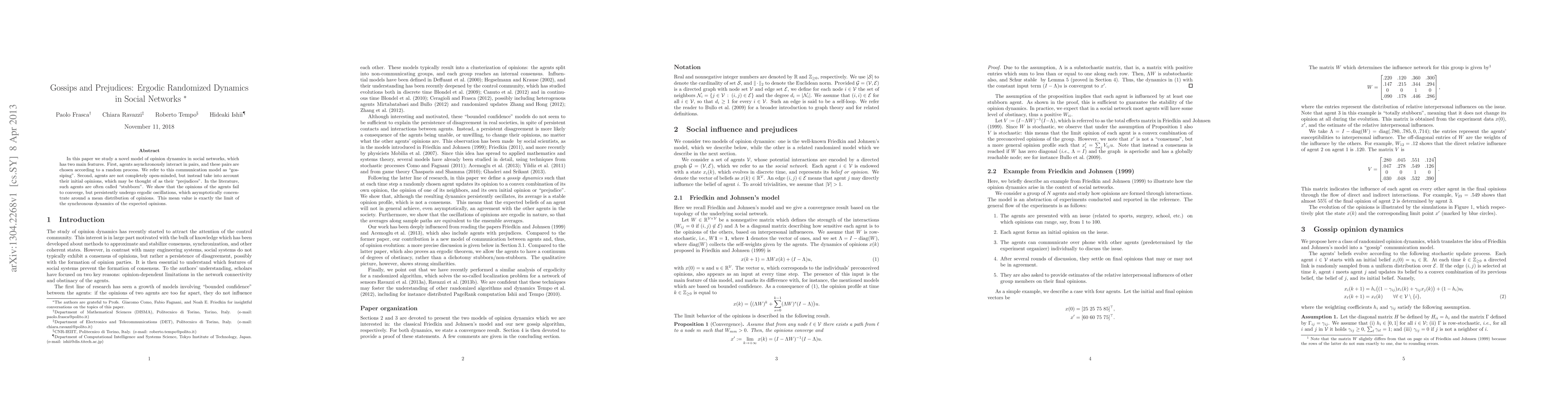 In this paper we study a novel model of opinion dynamics in social networks, which has two main features. First, agents asynchronously interact in pairs, and these pairs are chosen according to a random process. We refer to this communication model as "gossiping". Second, agents are not completely open-minded, but instead take into account their initial opinions, which may be thought of as their "prejudices". In the literature, such agents are often called "stubborn". We show that the opinions of the agents fail to converge, but persistently undergo ergodic oscillations, which asymptotically concentrate around a mean distribution of opinions. This mean value is exactly the limit of the synchronous dynamics of the expected opinions.
