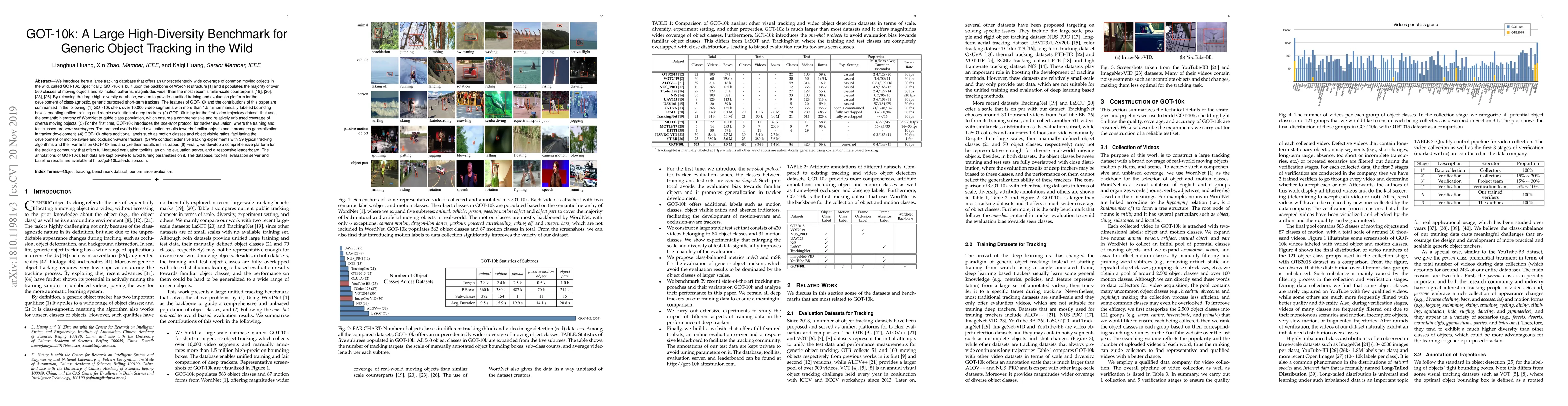 We introduce here a large tracking database that offers an unprecedentedly wide coverage of common moving objects in the wild, called GOT-10k. Specifically, GOT-10k is built upon the backbone of WordNet structure and it populates the majority of over 560 classes of moving objects and 87 motion patterns, magnitudes wider than the most recent similar-scale counterparts. The contributions of this paper are summarized in the following: (1) GOT-10k offers over 10,000 video segments with more than 1.5 million manually labeled bounding boxes, enabling unified training and stable evaluation of deep trackers. (2) GOT-10k is by far the first video trajectory dataset that uses the semantic hierarchy of WordNet to guide class population. (3) For the first time, GOT-10k introduces the one-shot protocol for tracker evaluation, where the training and test classes are zero-overlapped. The protocol avoids biased evaluation results towards familiar objects and it promotes generalization in tracker development. (4) We conduct extensive tracking experiments with 39 typical tracking algorithms on GOT-10k and analyze their results in this paper. (5) Finally, we develop a comprehensive platform for the tracking community that offers full-featured evaluation toolkits, an online evaluation server, and a responsive leaderboard. The annotations of GOT-10k's test data are kept private to avoid tuning parameters on it. The database, toolkits, evaluation server and baseline results are available at http://got-10k.aitestunion.com.