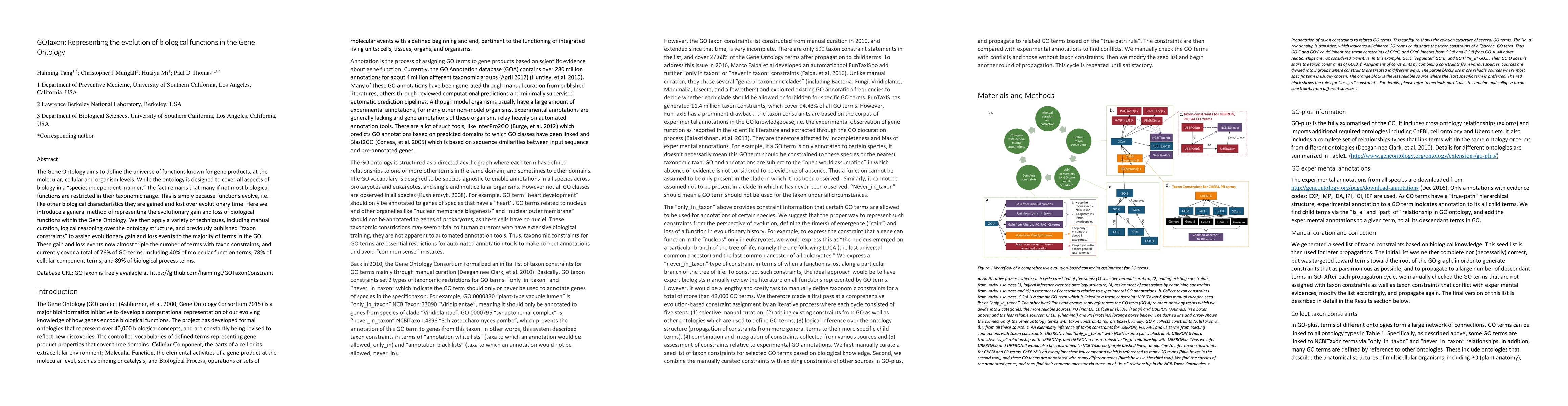 GOTaxon introduces a method to represent the evolutionary gain and loss of biological functions within the Gene Ontology, significantly expanding the ontology's coverage of taxonomic constraints to 76% of its terms. This approach combines manual curation, logical reasoning, and taxon constraints to reflect the evolutionary history of biological functions.