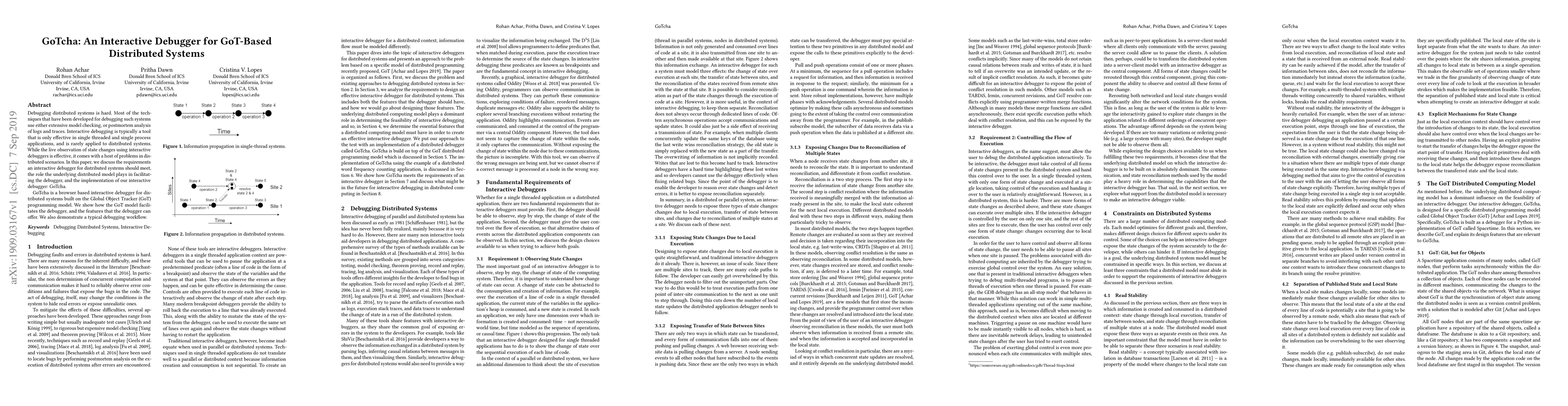 Title: GoTcha: An Interactive Debugger for GoT-Based Distributed Systems Summary: This paper introduces GoTcha, an interactive debugger for distributed systems built on the Global Object Tracker (GoT) model, addressing the challenges of debugging in distributed environments and showcasing its implementation and typical debugging workflow.