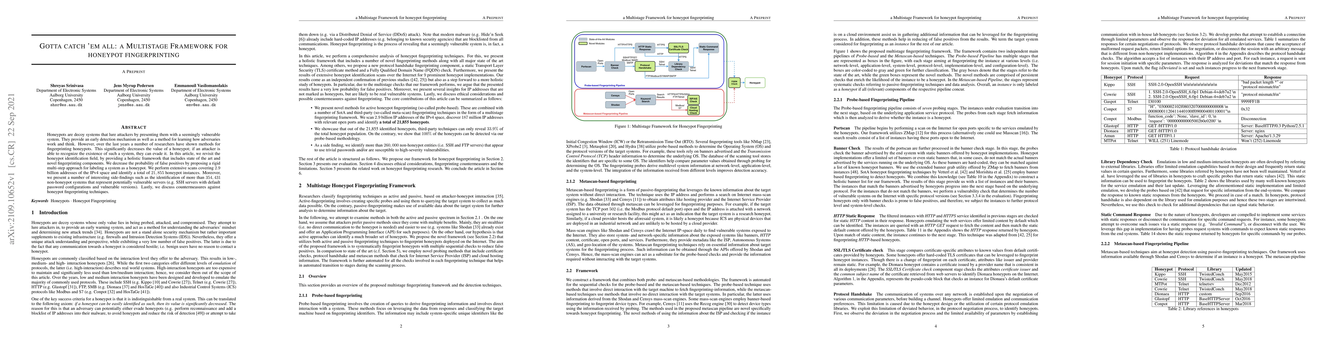 This paper proposes a multistage framework for honeypot fingerprinting to enhance the detection of honeypots while minimizing false positives. The authors conduct extensive scans across 2.9 billion IPv4 addresses, identifying 21,855 honeypot instances and over 354,000 potentially vulnerable servers, and discuss countermeasures against fingerprinting techniques.