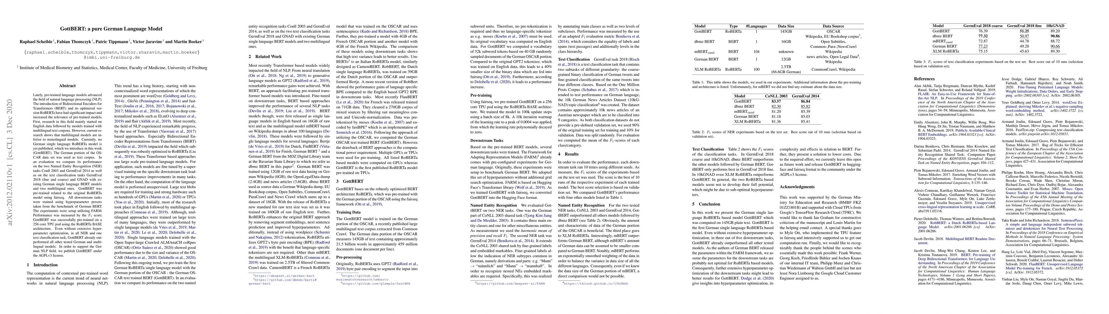GottBERT is a monolingual German RoBERTa model, pre-trained on the German portion of the OSCAR dataset, which outperforms existing German and multilingual BERT models on various NLP tasks, including NER and text classification. It is released under the AGPLv3 license to support the German NLP community.