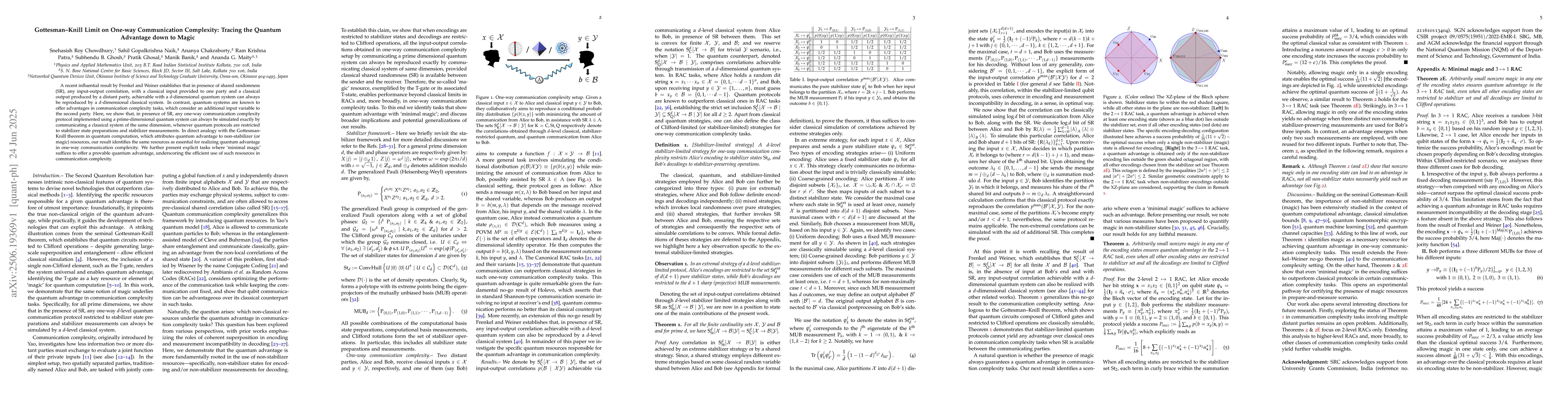 A recent influential result by Frenkel and Weiner establishes that in presence of shared randomness (SR), any input-output correlation, with a classical input provided to one party and a classical output produced by a distant party, achievable with a d-dimensional quantum system can always be reproduced by a d-dimensional classical system. In contrast, quantum systems are known to offer advantages in communication complexity tasks, which consider an additional input variable to the second party. Here, we show that, in presence of SR, any one-way communication complexity protocol implemented using a prime-dimensional quantum system can always be simulated exactly by communicating a classical system of the same dimension, whenever quantum protocols are restricted to stabilizer state preparations and stabilizer measurements. In direct analogy with the Gottesman-Knill theorem in quantum computation, which attributes quantum advantage to non-stabilizer (or magic) resources, our result identifies the same resources as essential for realizing quantum advantage in one-way communication complexity. We further present explicit tasks where `minimal magic' suffices to offer a provable quantum advantage, underscoring the efficient use of such resources in communication complexity.