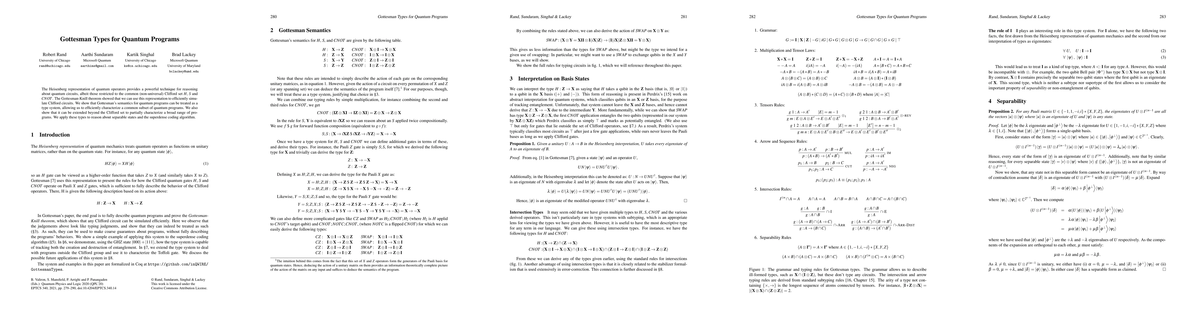 The Heisenberg representation of quantum operators provides a powerful technique for reasoning about quantum circuits, albeit those restricted to the common (non-universal) Clifford set H, S and CNOT. The Gottesman-Knill theorem showed that we can use this representation to efficiently simulate Clifford circuits. We show that Gottesman's semantics for quantum programs can be treated as a type system, allowing us to efficiently characterize a common subset of quantum programs. We also show that it can be extended beyond the Clifford set to partially characterize a broad range of programs. We apply these types to reason about separable states and the superdense coding algorithm.