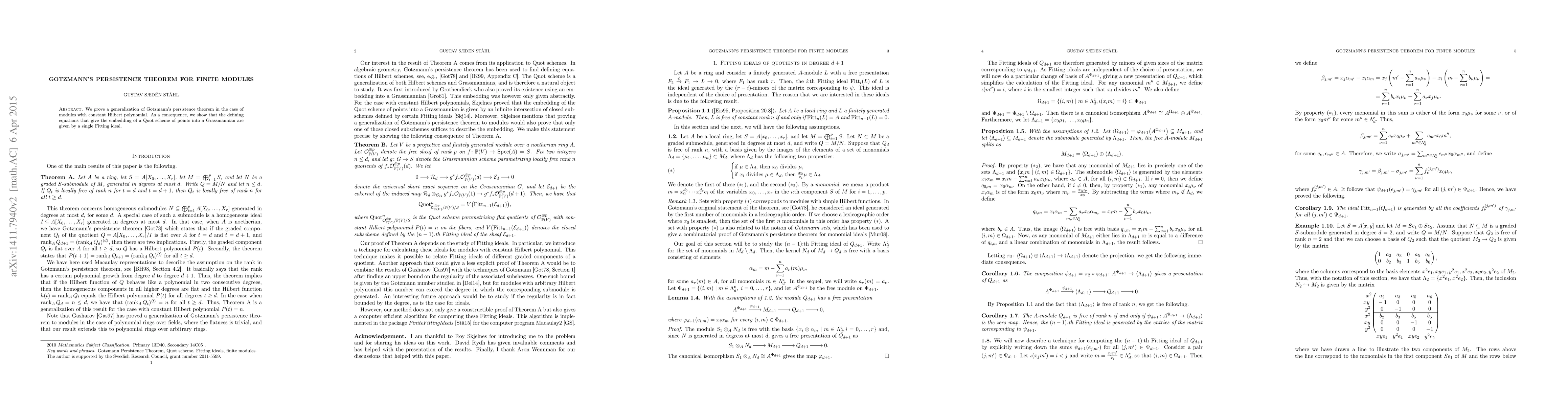 Summary: This paper generalizes Gotzmann's persistence theorem for modules with a constant Hilbert polynomial, demonstrating that the embedding of a Quot scheme into a Grassmannian is defined by a single Fitting ideal.