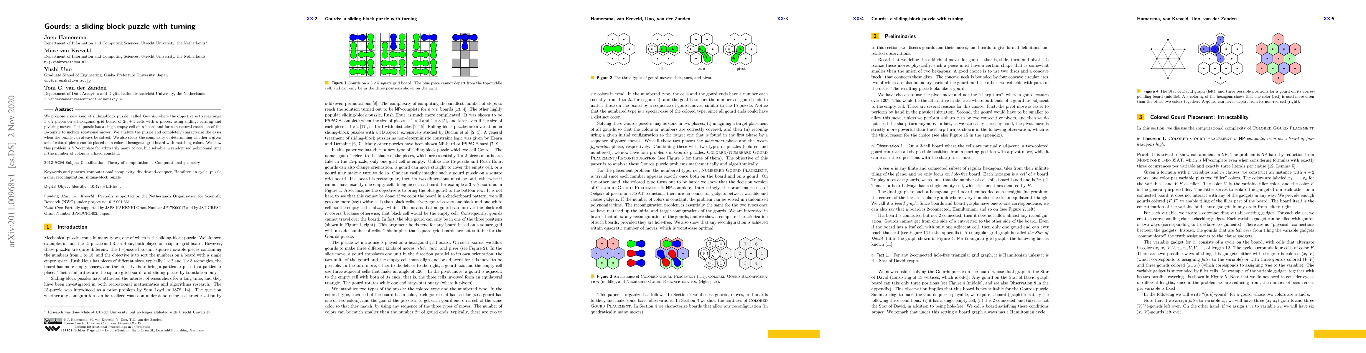 The Gourds puzzle involves rearranging 1 x 2 pieces on a hexagonal grid using sliding, turning, and pivoting moves. The paper characterizes solvability conditions and proves the problem of determining a solution's existence is NP-complete but solvable in randomized polynomial time for a fixed number of colors.