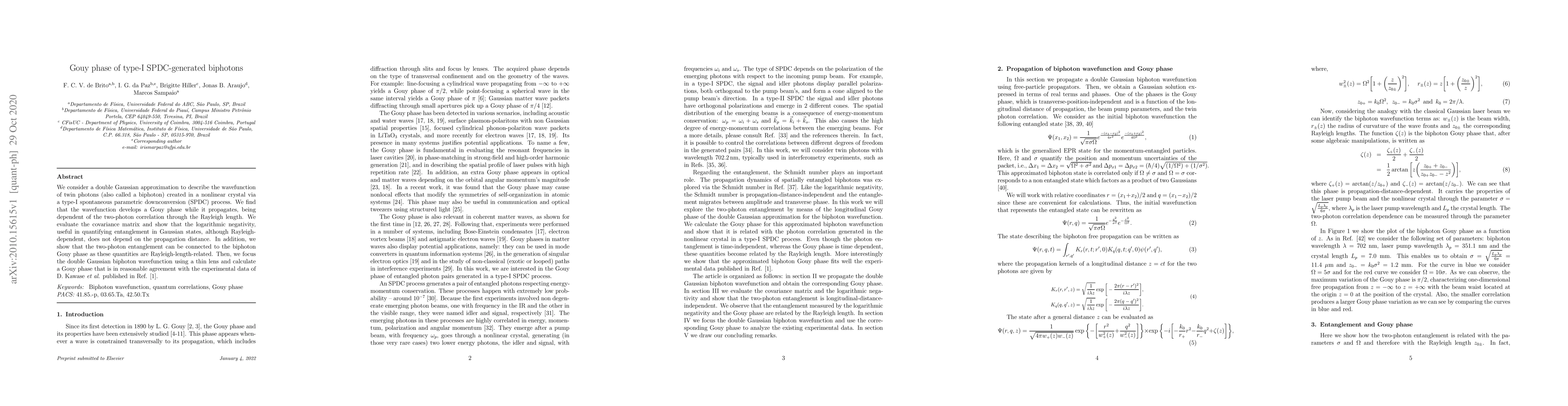 We consider a double Gaussian approximation to describe the wavefunction of twin photons (also called a biphoton) created in a nonlinear crystal via a type-I spontaneous parametric downconversion (SPDC) process. We find that the wavefunction develops a Gouy phase while it propagates, being dependent of the two-photon correlation through the Rayleigh length. We evaluate the covariance matrix and show that the logarithmic negativity, useful in quantifying entanglement in Gaussian states, although Rayleigh-dependent, does not depend on the propagation distance. In addition, we show that the two-photon entanglement can be connected to the biphoton Gouy phase as these quantities are Rayleigh-length-related. Then, we focus the double Gaussian biphoton wavefunction using a thin lens and calculate a Gouy phase that is in reasonable agreement with the experimental data of D. Kawase et al. published in Ref. [1].