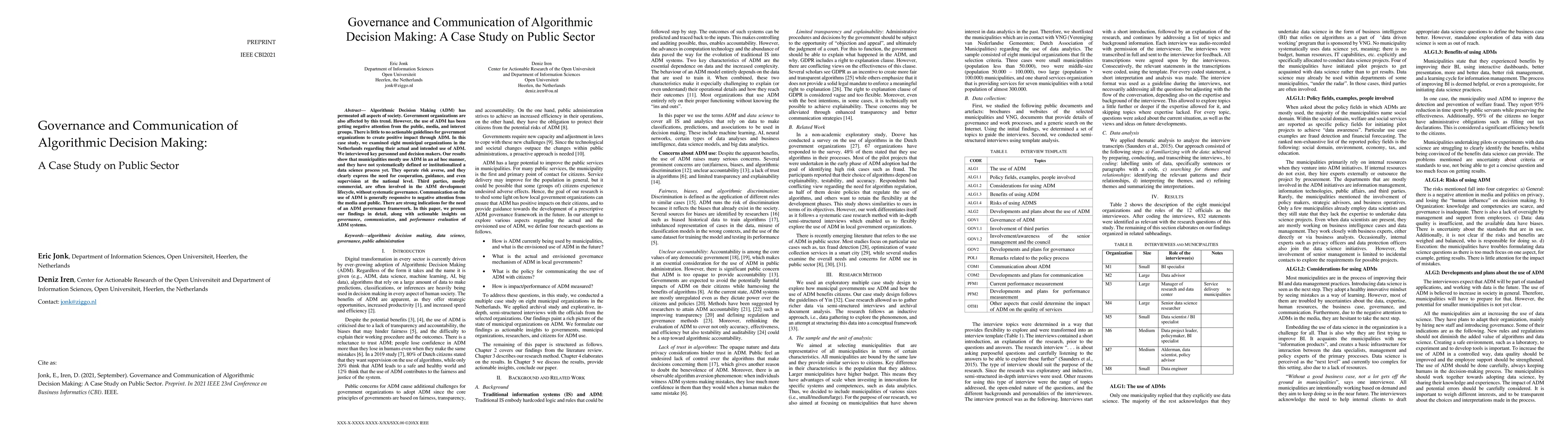 A case study of 8 Dutch municipal organizations found that they mostly use Algorithmic Decision Making (ADM) in an ad hoc manner without a systematic data science process or governance framework, highlighting the need for cooperation, guidance, and supervision at the national level.