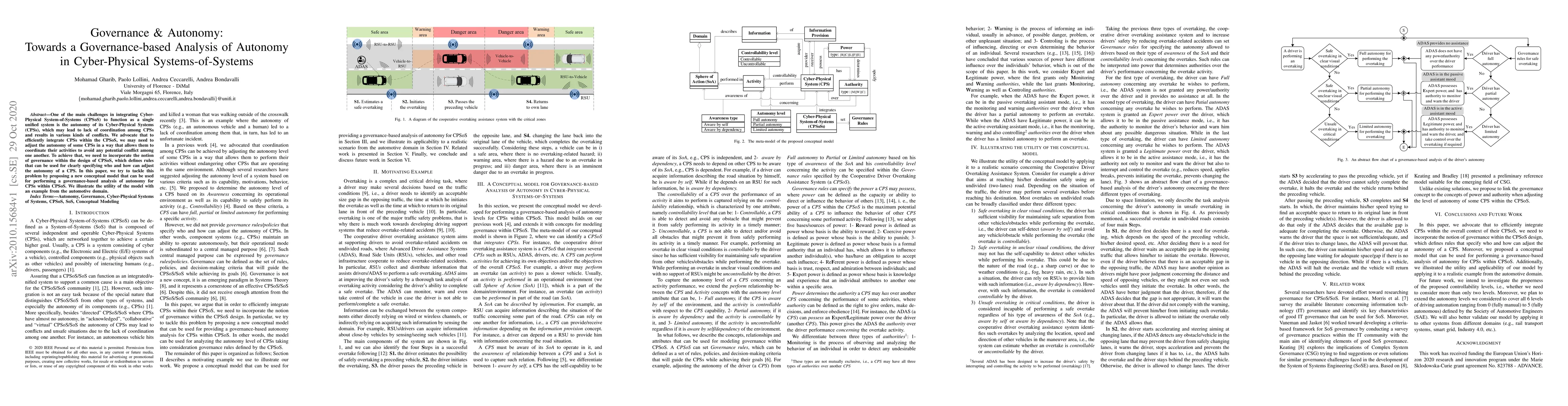 This paper proposes a governance-based conceptual model to analyze and adjust the autonomy of Cyber-Physical Systems (CPSs) within Cyber-Physical Systems-of-Systems (CPSoS) to enhance coordination and avoid conflicts. An example from the automotive domain demonstrates the model's utility.