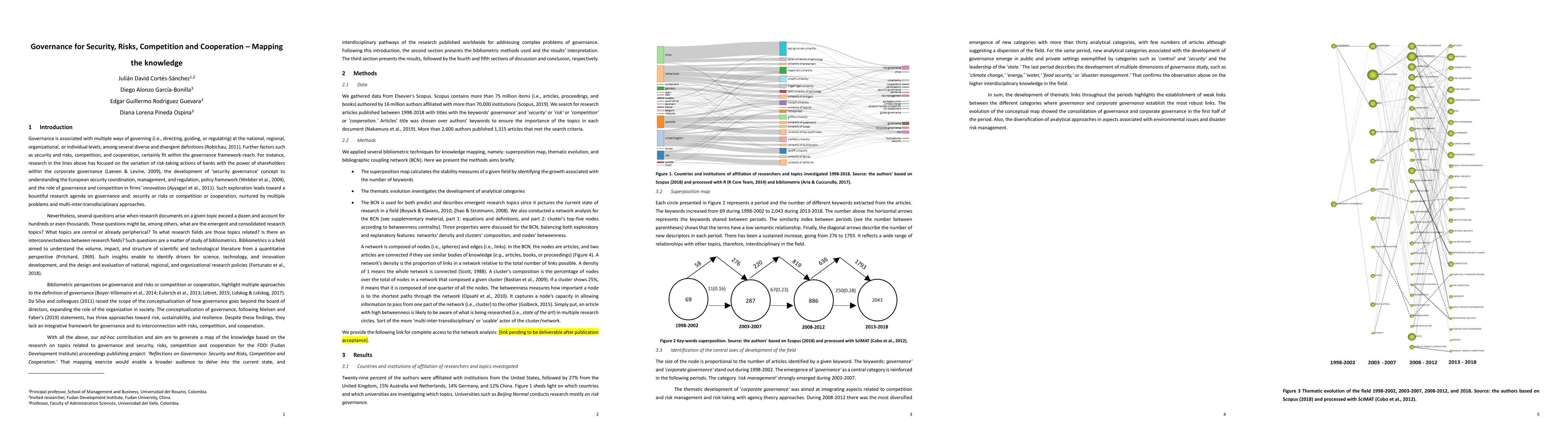 The study aims to generate a map of the knowledge based on the research on topics related to governance and security, risks, competition and cooperation for the FDDI (Fudan Development Institute) proceedings publishing project: 'Reflections on Governance: Security and Risks, Competition and Cooperation.' That mapping exercise would enable a broader audience to delve into the current state, and interdisciplinary pathways of the research published worldwide for addressing complex problems of governance. Following this introduction, the second section presents the bibliometric methods used and the results' interpretation. The third section presents the results, followed by the fourth and fifth sections of discussion and conclusion, respectively.