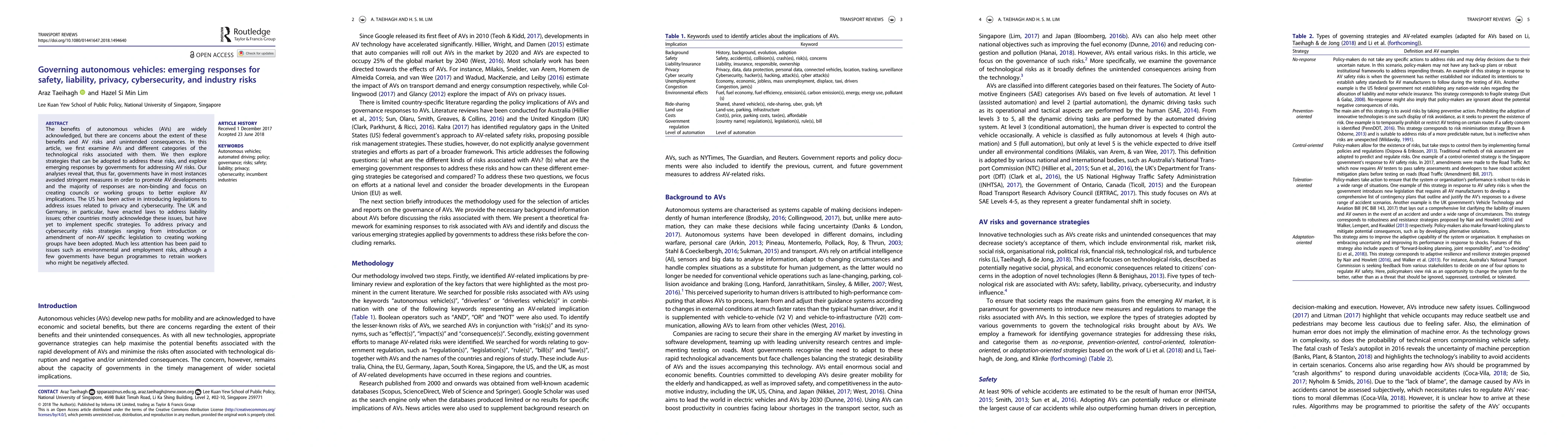 This paper examines the risks associated with autonomous vehicles (AVs) and explores strategies to mitigate them, highlighting that governments have largely avoided stringent measures, focusing instead on non-binding responses and forming councils to study AV implications. The US has introduced legislation for privacy and cybersecurity, while the UK and Germany have addressed liability issues, with other countries acknowledging but not yet implementing specific strategies.