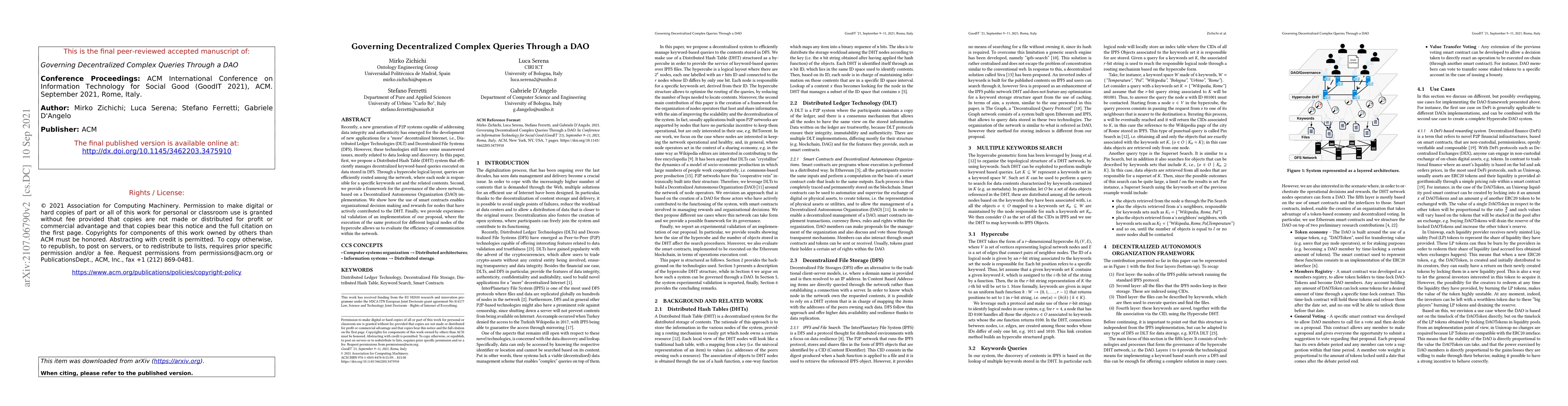 Recently, a new generation of P2P systems capable of addressing data integrity and authenticity has emerged for the development of new applications for a "more" decentralized Internet, i.e., Distributed Ledger Technologies (DLT) and Decentralized File Systems (DFS). However, these technologies still have some unanswered issues, mostly related to data lookup and discovery. In this paper, first, we propose a Distributed Hash Table (DHT) system that efficiently manages decentralized keyword-based queries executed on data stored in DFS. Through a hypercube logical layout, queries are efficiently routed among the network, where each node is responsible for a specific keywords set and the related contents. Second, we provide a framework for the governance of the above network, based on a Decentralized Autonomous Organization (DAO) implementation. We show how the use of smart contracts enables organizational decision making and rewards for nodes that have actively contributed to the DHT. Finally, we provide experimental validation of an implementation of our proposal, where the execution of the same protocol for different logical nodes of the hypercube allows us to evaluate the efficiency of communication within the network.