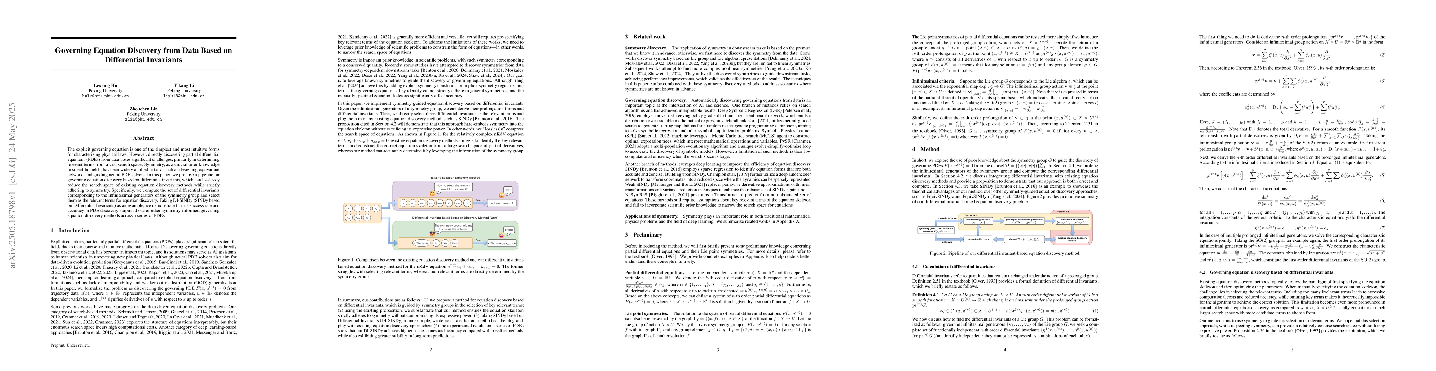 The paper proposes a pipeline for governing equation discovery based on differential invariants, which reduces the search space of existing equation discovery methods while adhering to symmetry. It computes the set of differential invariants corresponding to the infinitesimal generators of the symmetry group and uses them as relevant terms for equation discovery, demonstrated via DI-SINDy (SINDy based on Differential Invariants).