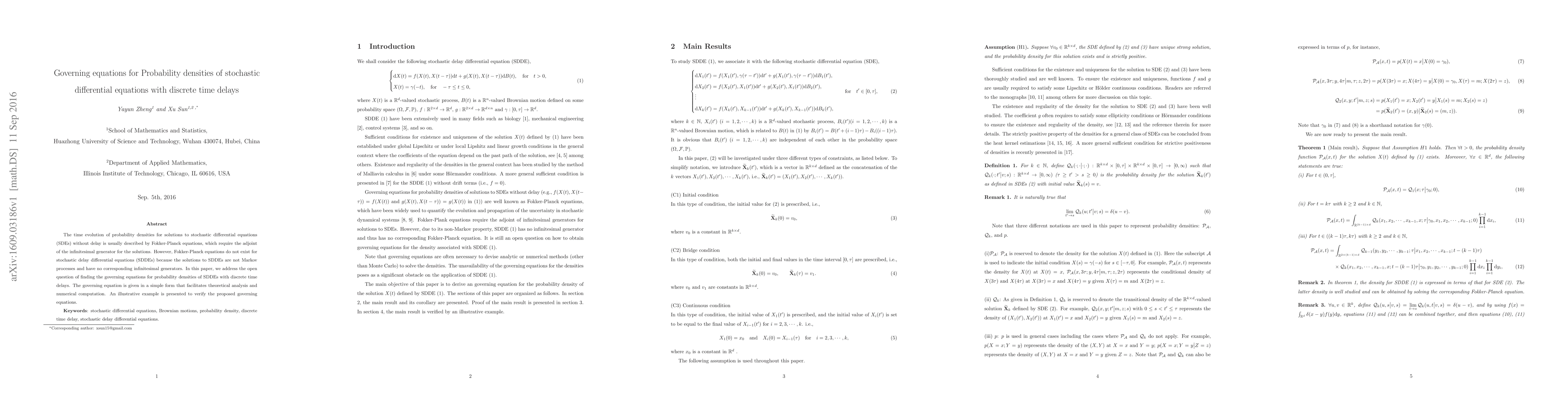 This paper develops a governing equation for the probability densities of stochastic differential equations with discrete time delays, providing a solution where traditional Fokker-Planck equations fail due to the non-Markovian nature of solutions to stochastic delay differential equations. An example verifies the proposed equation's utility.