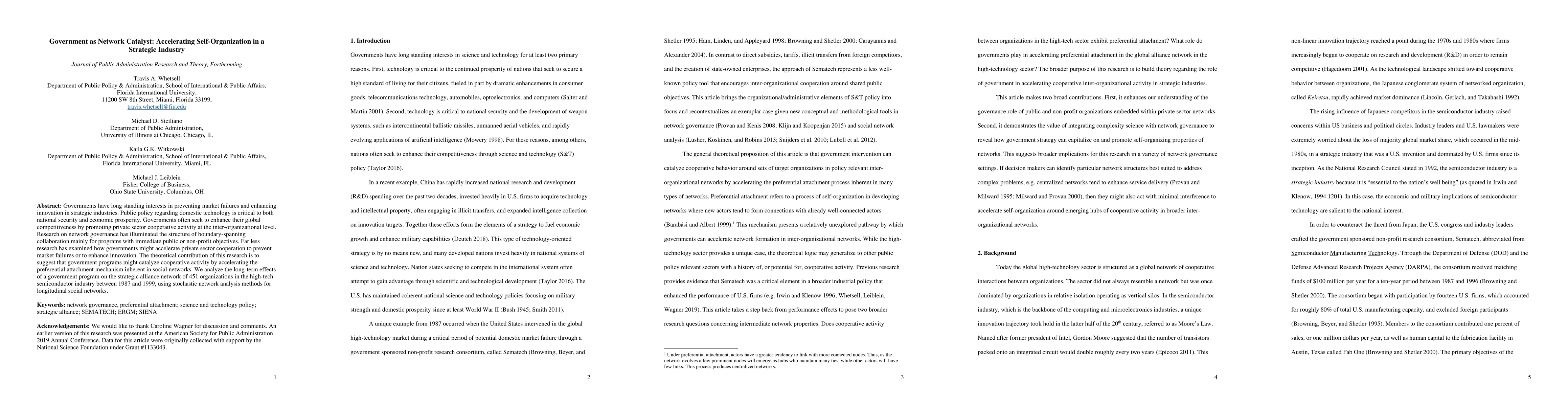 Governments have long standing interests in preventing market failures and enhancing innovation in strategic industries. Public policy regarding domestic technology is critical to both national security and economic prosperity. Governments often seek to enhance their global competitiveness by promoting private sector cooperative activity at the inter-organizational level. Research on network governance has illuminated the structure of boundary-spanning collaboration mainly for programs with immediate public or non-profit objectives. Far less research has examined how governments might accelerate private sector cooperation to prevent market failures or to enhance innovation. The theoretical contribution of this research is to suggest that government programs might catalyze cooperative activity by accelerating the preferential attachment mechanism inherent in social networks. We analyze the long-term effects of a government program on the strategic alliance network of 451 organizations in the high-tech semiconductor industry between 1987 and 1999, using stochastic network analysis methods for longitudinal social networks.