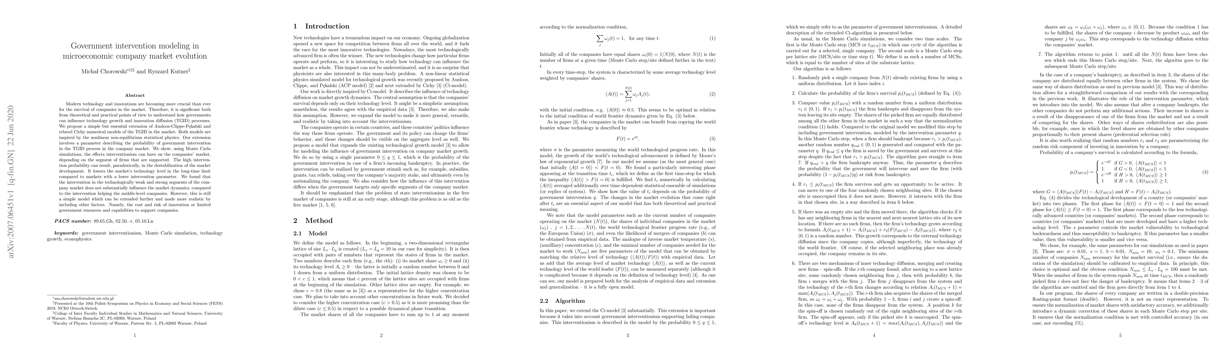 Modern technology and innovations are becoming more crucial than ever for the survival of companies in the market. Therefore, it is significant both from theoretical and practical points of view to understand how governments can influence technology growth and innovation diffusion (TGID) processes. We propose a simple but essential extension of Ausloos-Clippe-P\c{e}kalski and related Cichy numerical models of the TGID in the market. Both models are inspired by the nonlinear non-equilibrium statistical physics. Our extension involves a parameter describing the probability of government intervention in the TGID process in the company market. We show, using Monte Carlo simulations, the effects interventionism can have on the companies' market, depending on the segment of firms that are supported. The high intervention probability can result, paradoxically, in the destabilization of the market development. It lowers the market's technology level in the long-time limit compared to markets with a lower intervention parameter. We found that the intervention in the technologically weak and strong segments of the company market does not substantially influence the market dynamics, compared to the intervention helping the middle-level companies. However, this is still a simple model which can be extended further and made more realistic by including other factors. Namely, the cost and risk of innovation or limited government resources and capabilities to support companies.
