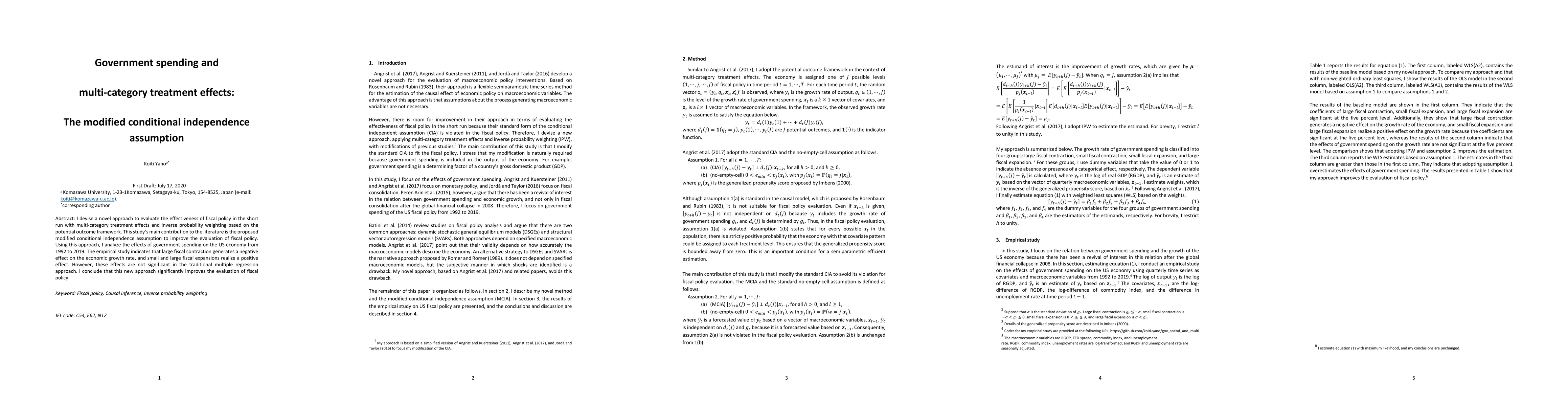 I devise a novel approach to evaluate the effectiveness of fiscal policy in the short run with multi-category treatment effects and inverse probability weighting based on the potential outcome framework. This study's main contribution to the literature is the proposed modified conditional independence assumption to improve the evaluation of fiscal policy. Using this approach, I analyze the effects of government spending on the US economy from 1992 to 2019. The empirical study indicates that large fiscal contraction generates a negative effect on the economic growth rate, and small and large fiscal expansions realize a positive effect. However, these effects are not significant in the traditional multiple regression approach. I conclude that this new approach significantly improves the evaluation of fiscal policy.
