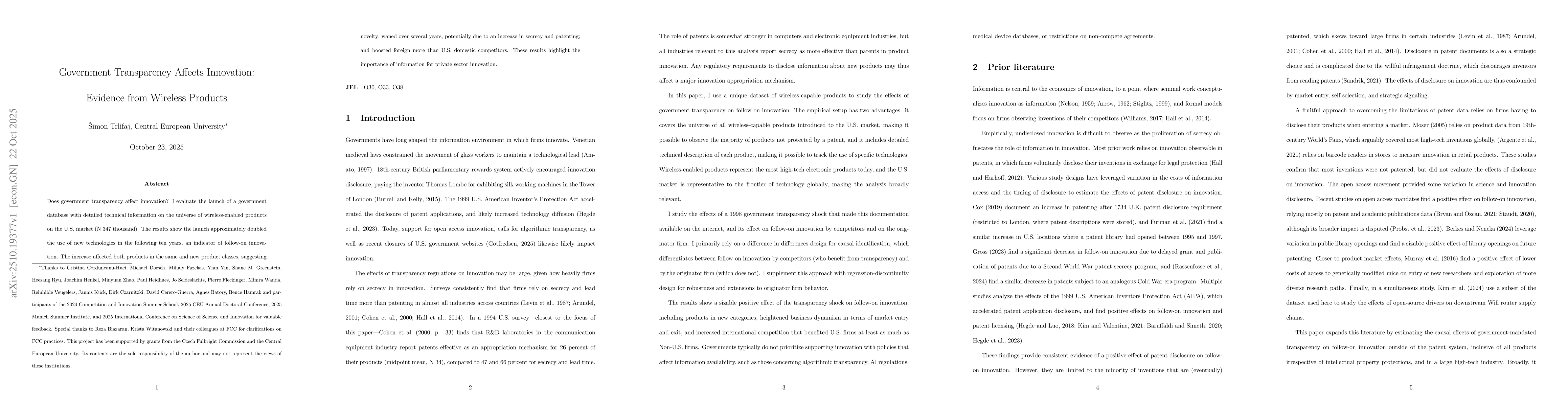 Does government transparency affect innovation? I evaluate the launch of a government database with detailed technical information on the universe of wireless-enabled products on the U.S. market (N 347 thousand). The results show the launch approximately doubled the use of new technologies in the following ten years, an indicator of follow-on innovation. The increase affected both products in the same and new product classes, suggesting novelty; waned over several years, potentially due to an increase in secrecy and patenting; and boosted foreign more than U.S. domestic competitors. These results highlight the importance of information for private sector innovation.