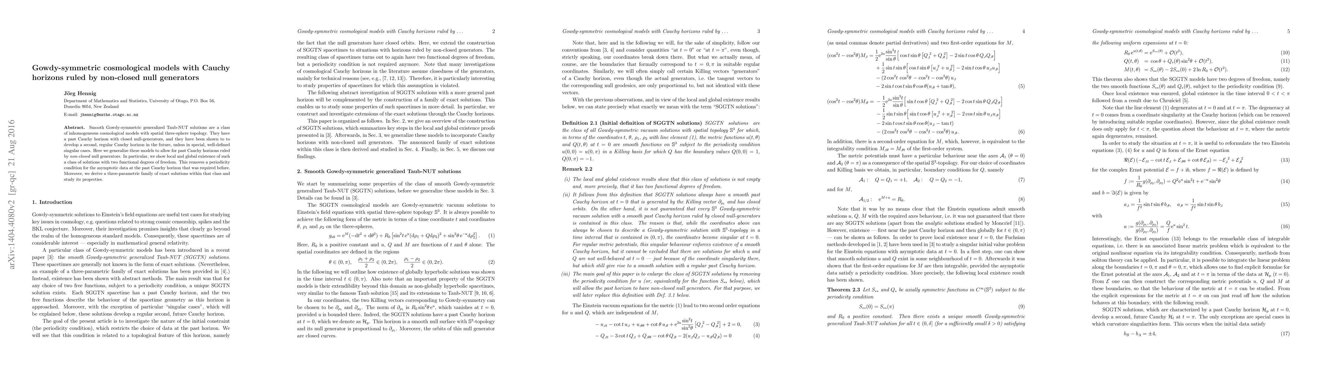 This paper generalizes Gowdy-symmetric cosmological models to include past Cauchy horizons ruled by non-closed null generators, showing local and global existence of such solutions with two functional degrees of freedom. It removes a previous periodicity condition and presents a three-parametric family of exact solutions.
