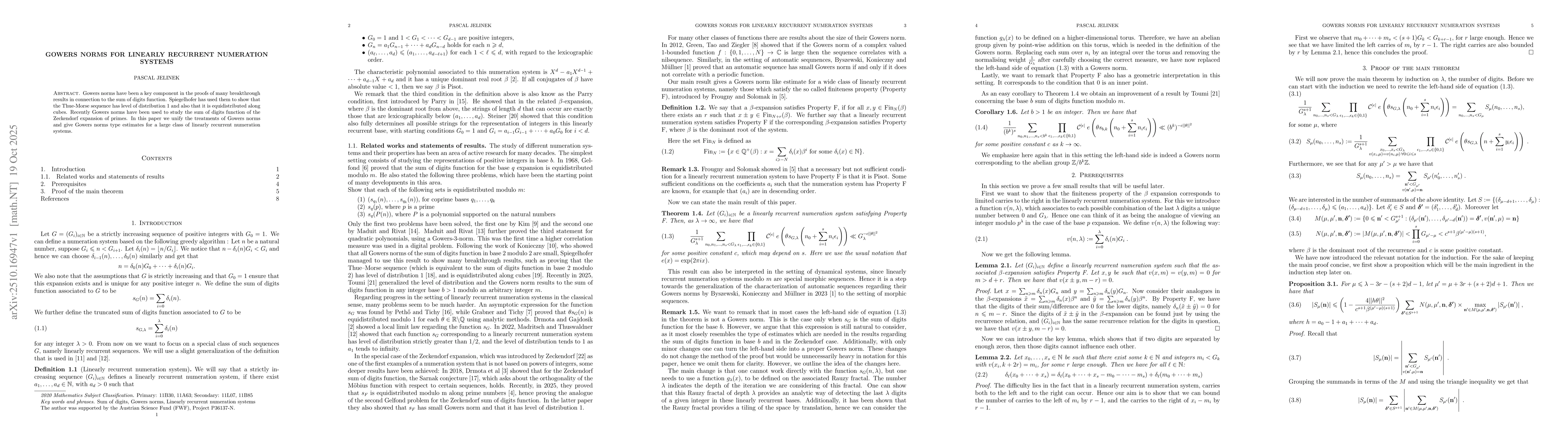 Gowers norms have been a key component in the proofs of many breakthrough results in connection to the sum of digits function. Spiegelhofer has used them to show that the Thue-Morse sequence has level of distribution 1 and also that it is equidistributed along cubes. Recently Gowers norms have been used to study the sum of digits function of the Zeckendorf expansion of primes. In this paper we unify the treatments of Gowers norms and give Gowers norms type estimates for a large class of linearly recurrent numeration systems.